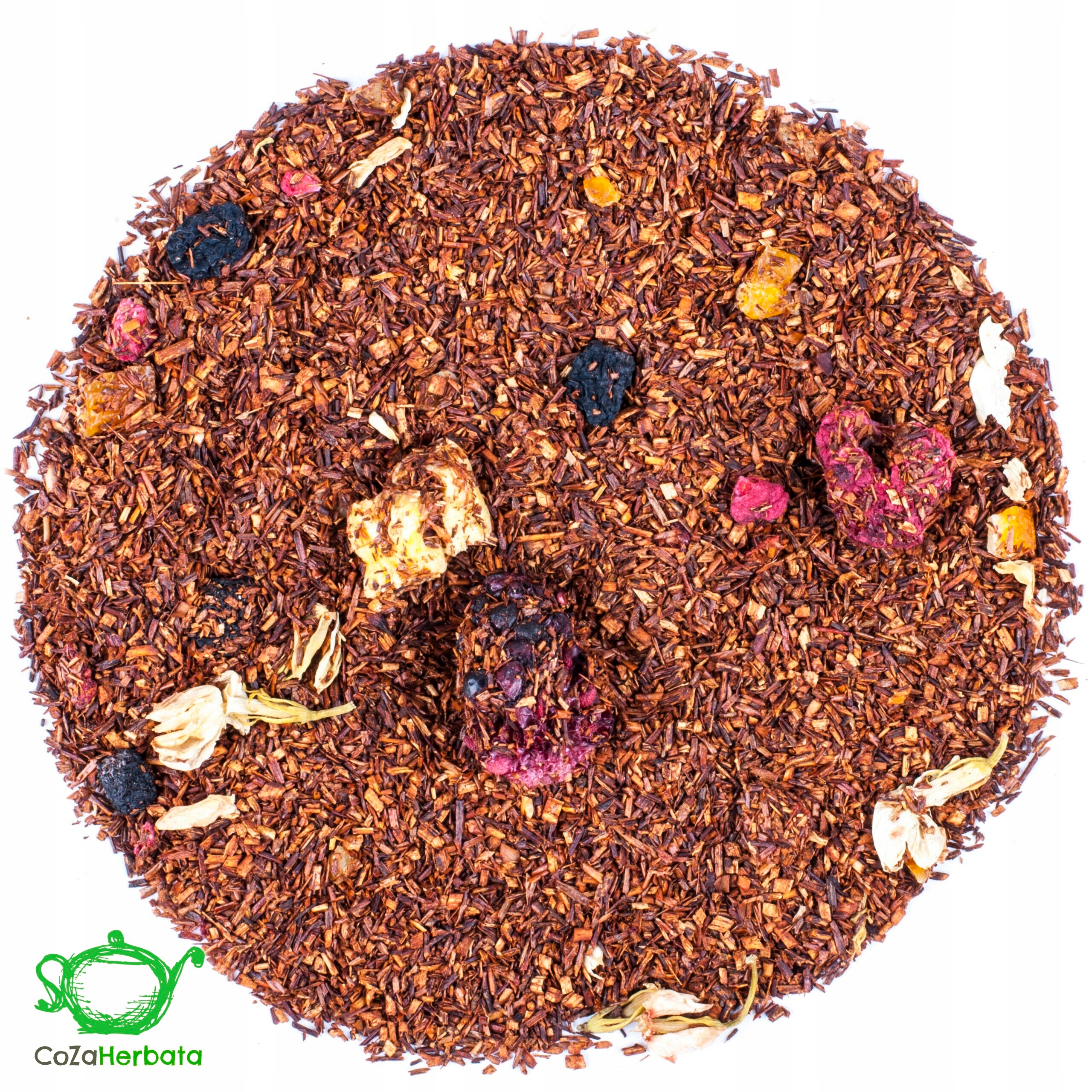 Ройбуш, апельсиновые цукаты, черноплодная рябина, клубника сублимированная, персик сублимированная, ежевика сублимированная, жасмин, малина сублимированная, аромат.