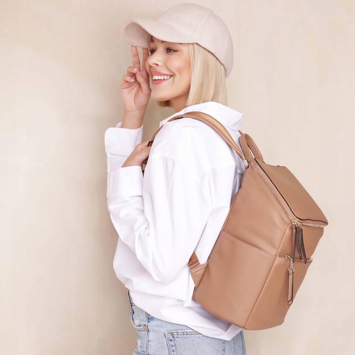 ROOMY выполнен из приятной на ощупь и легко чистящейся эко-кожи, которая защитит содержимое рюкзака даже в дождливую погоду.