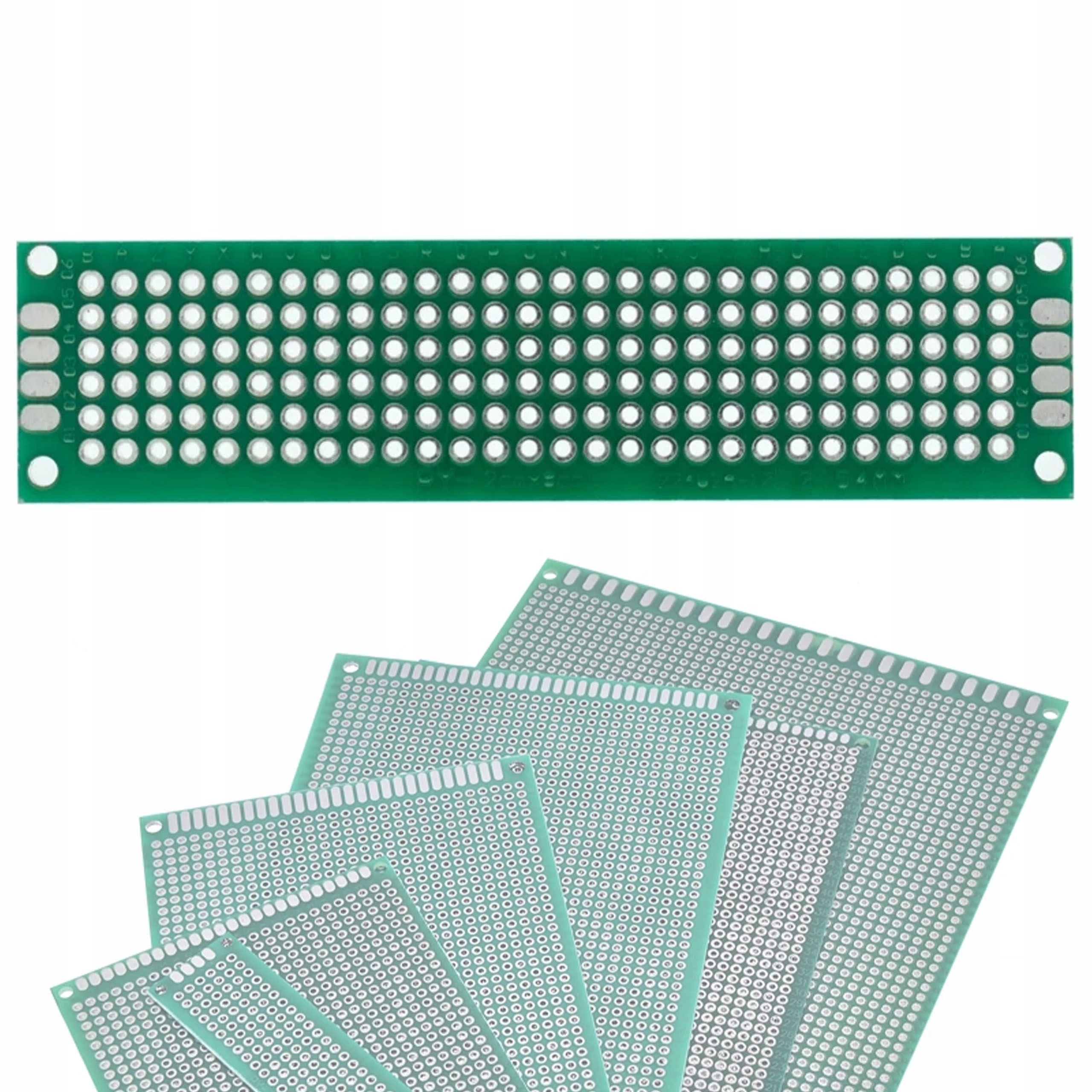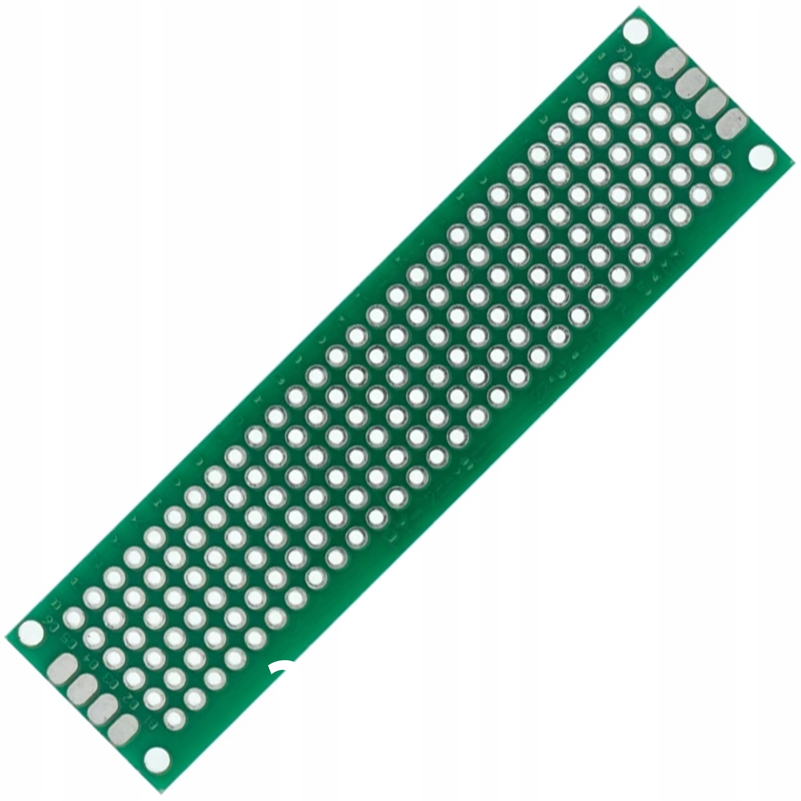 Двусторонняя универсальная плата размерами 20 х 80 мм, предназначенная для построения прототипов систем из элементов сквозного монтажа (THT), таких как резисторы, конденсаторы, светодиоды и интегральные схемы в DIP-корпусах. Плата позволяет установить любую электронную систему благодаря отверстиям с шагом 2,54 мм, расположенным в прямоугольной матрице.