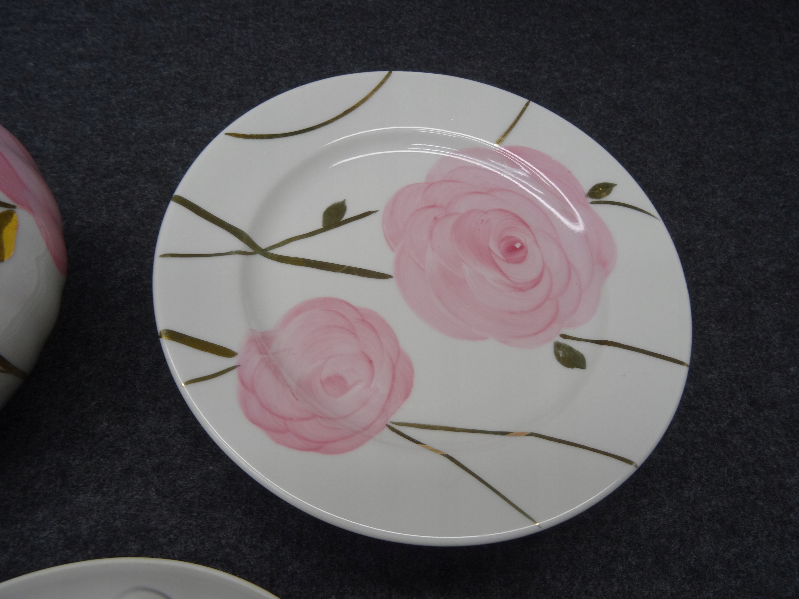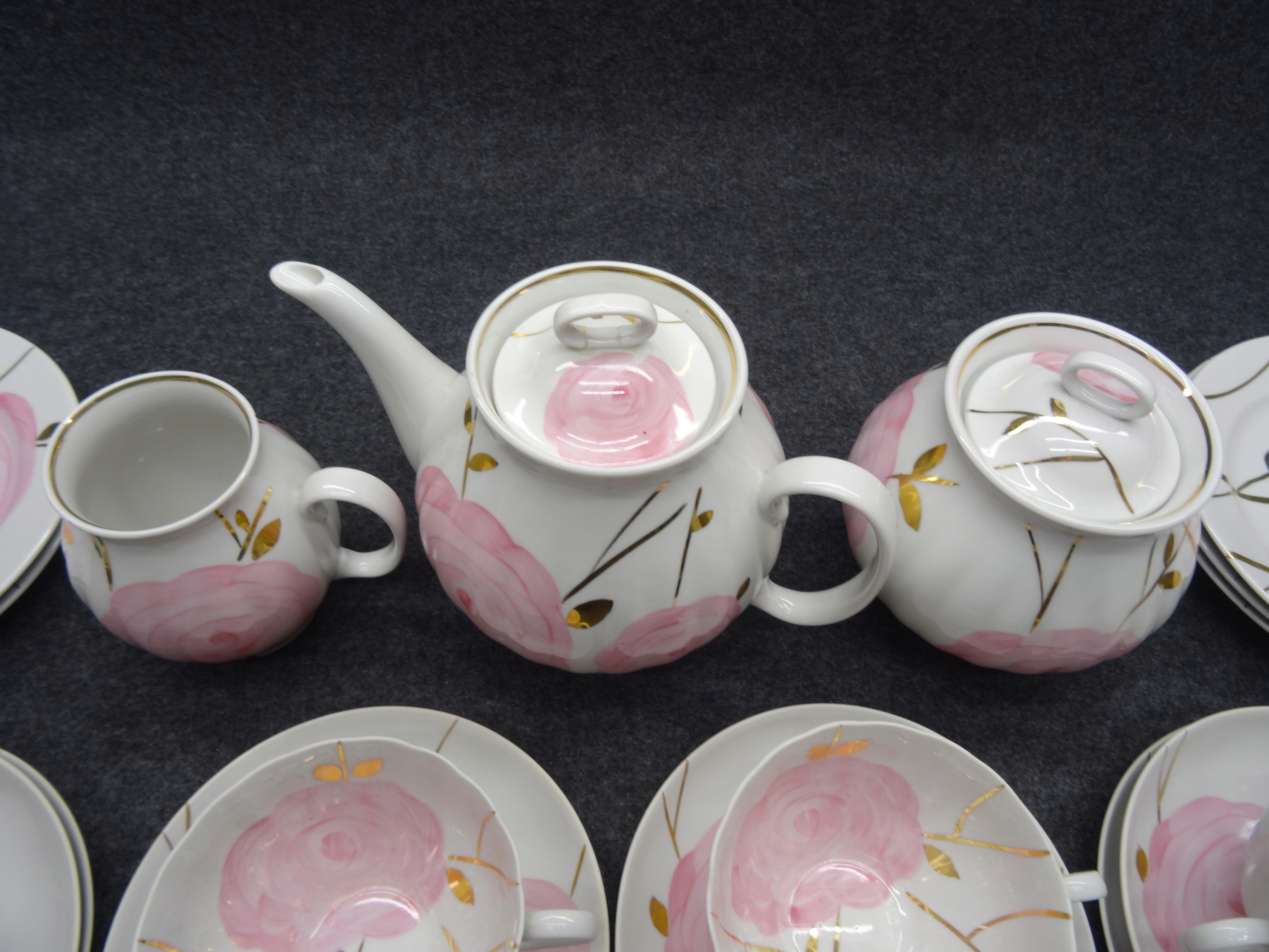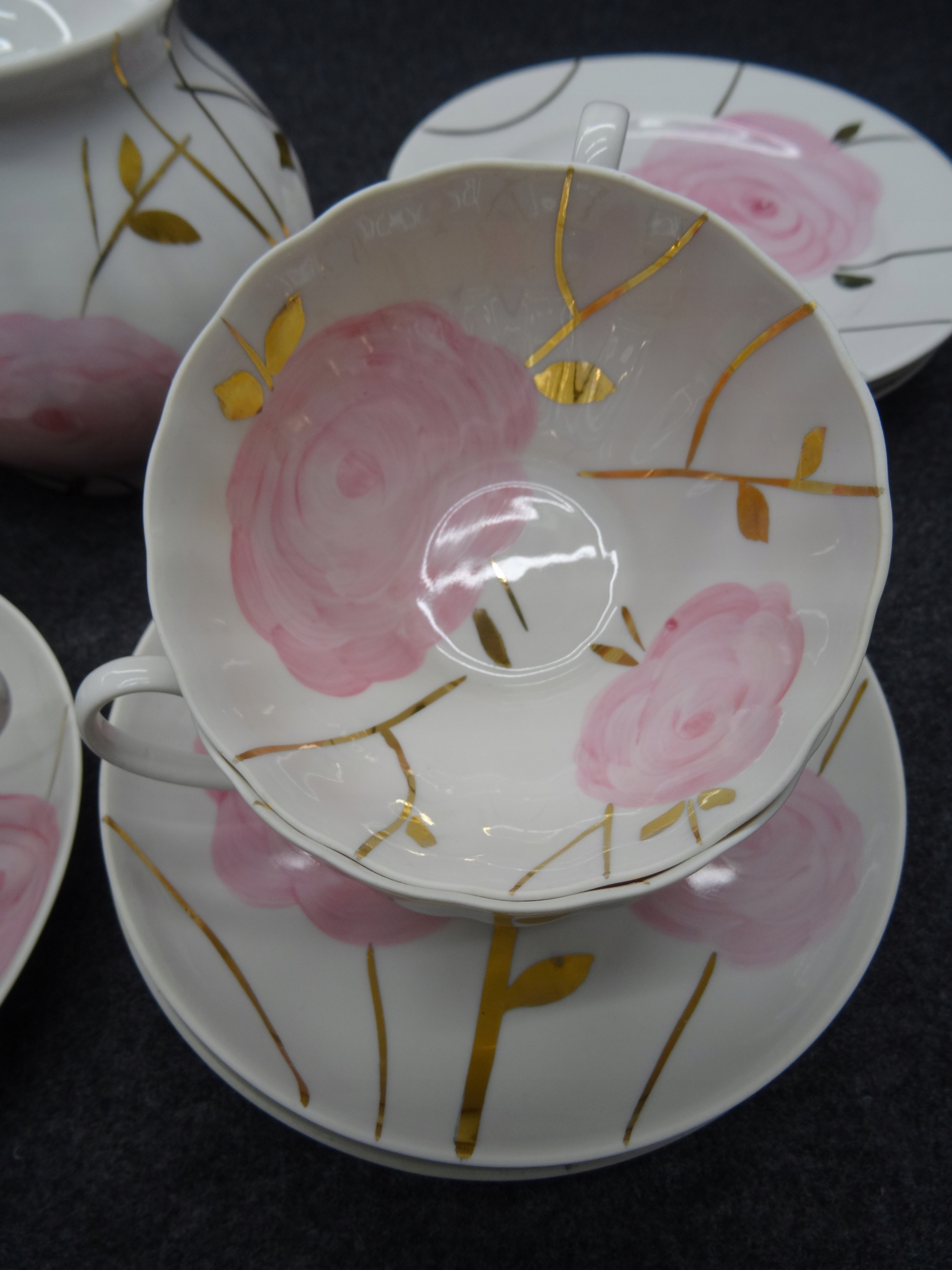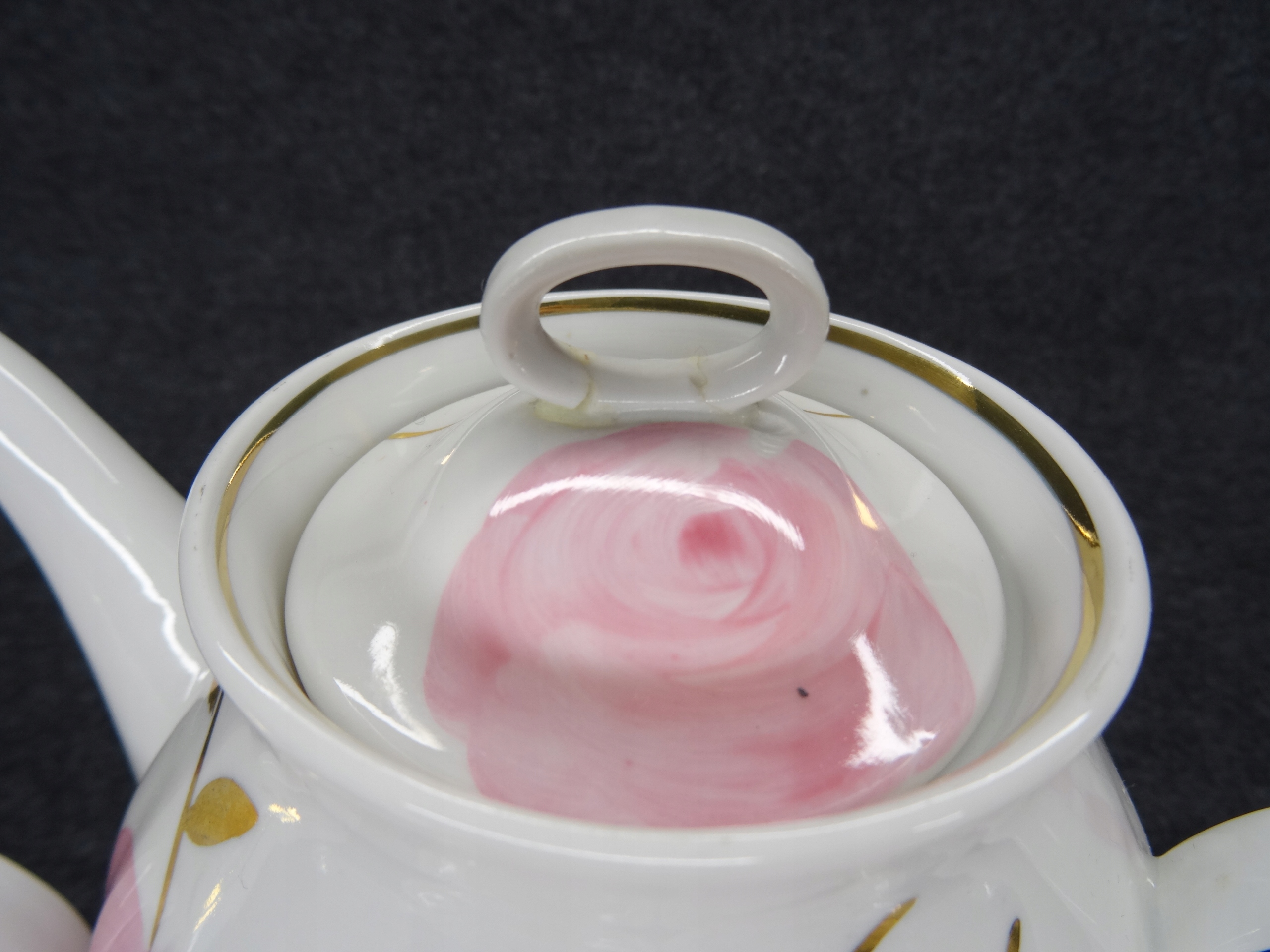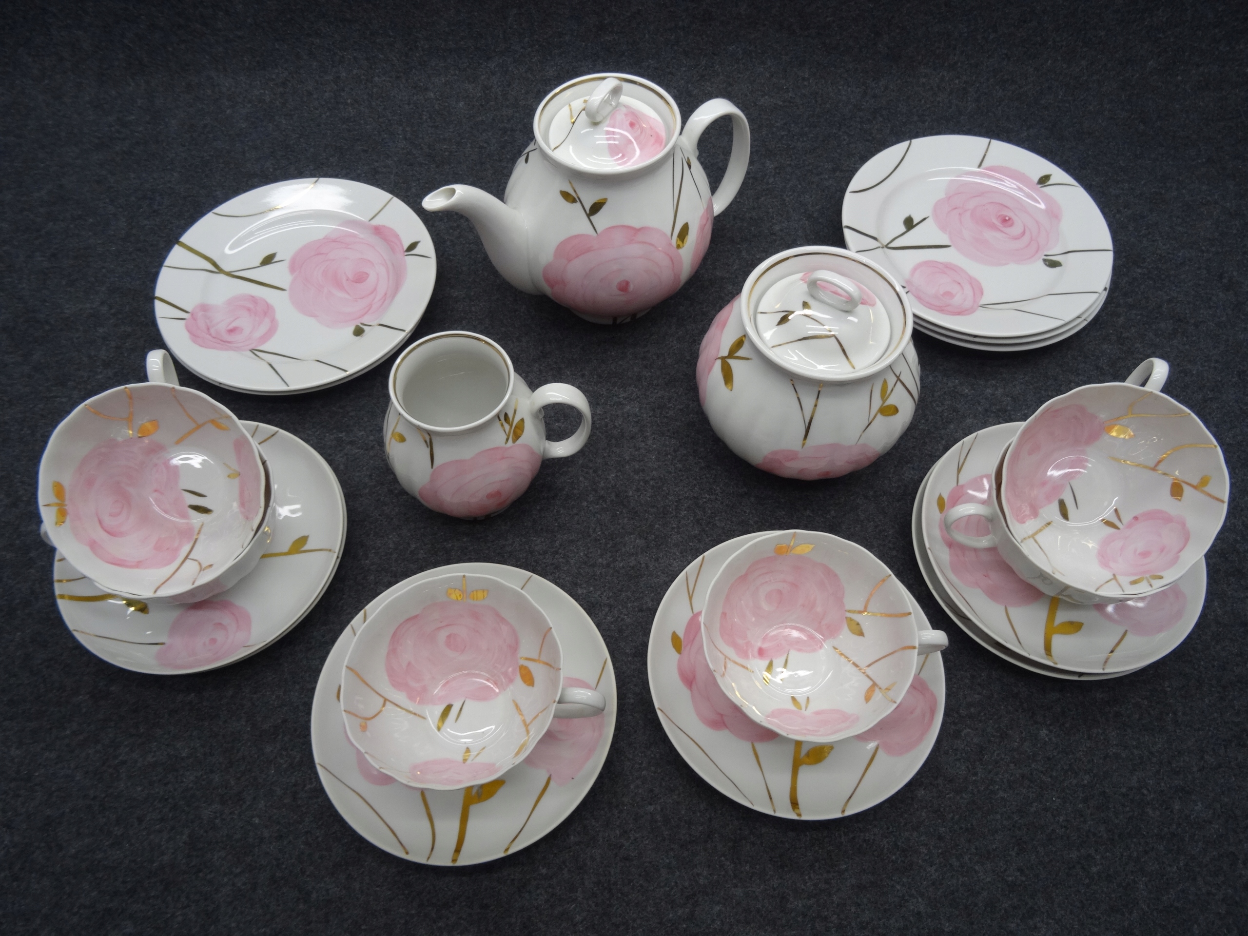 Фарфоровый чайный сервиз на шесть персон. Русская Дулевская Фабрика, ручная роспись розовыми цветами. Сервиз состоит из следующих элементов: кувшин, сахарница, молочник, чашки 6 шт, тарелки маленькие 5 шт, десертные тарелки большего размера.