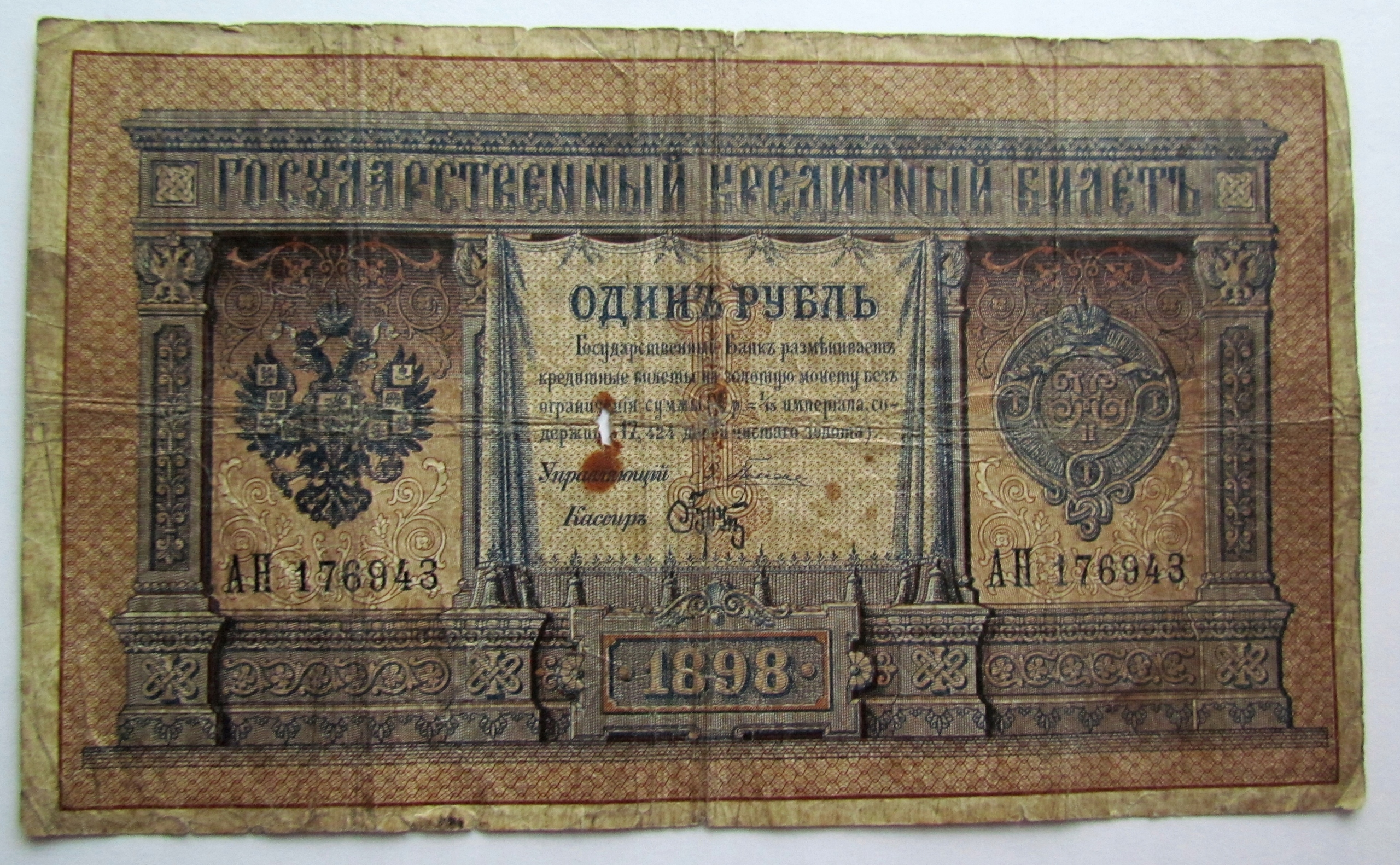 Я предлагаю российскую банкноту 1 Рубель 1898 г. Плеке - Брут, Стэн 4, видимый на прикрепленных фотографиях. Я рекомендую