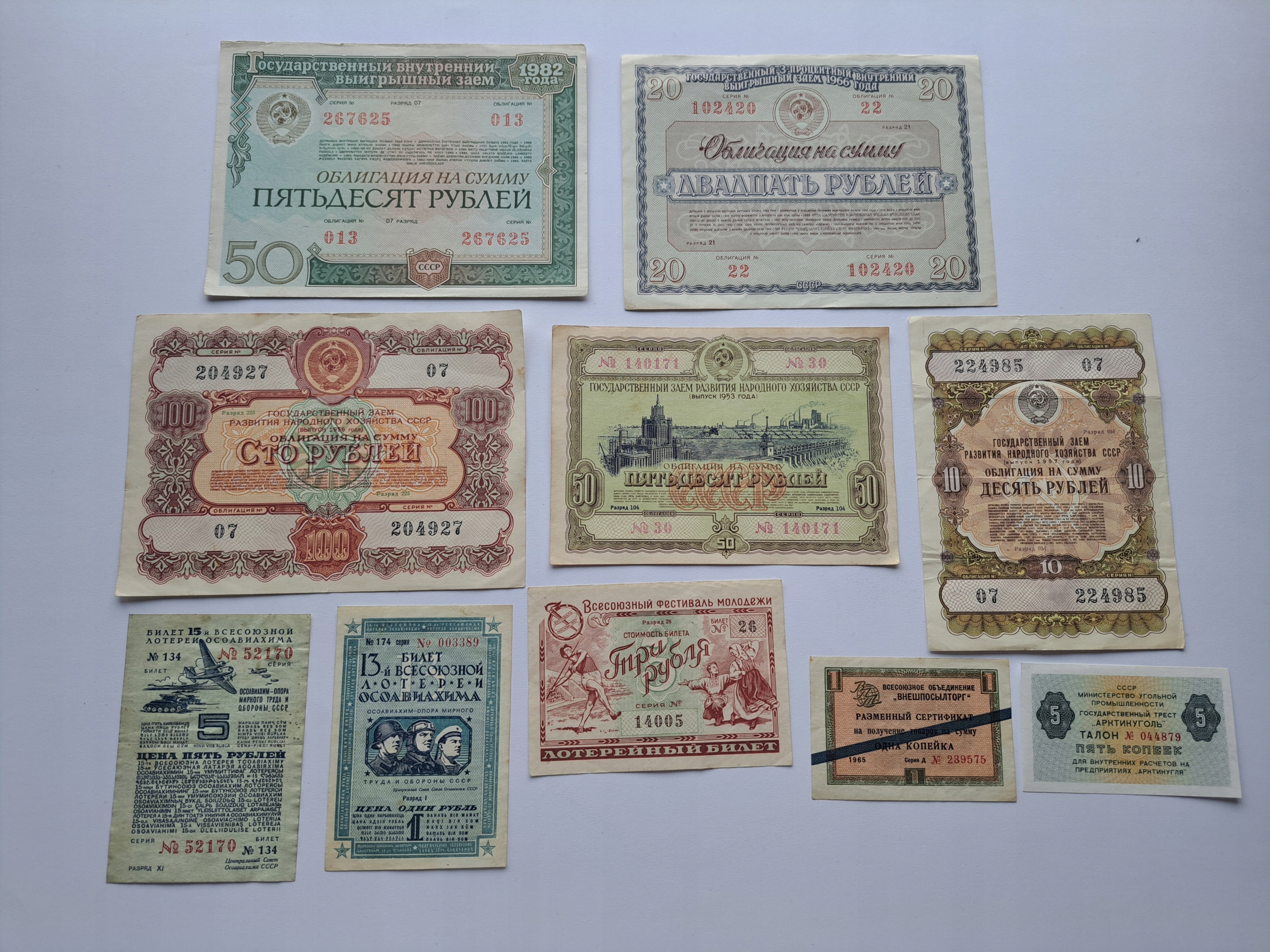 Российские облигации, билеты и прочее - разных годов, номиналов, разновидностей - 10 штук