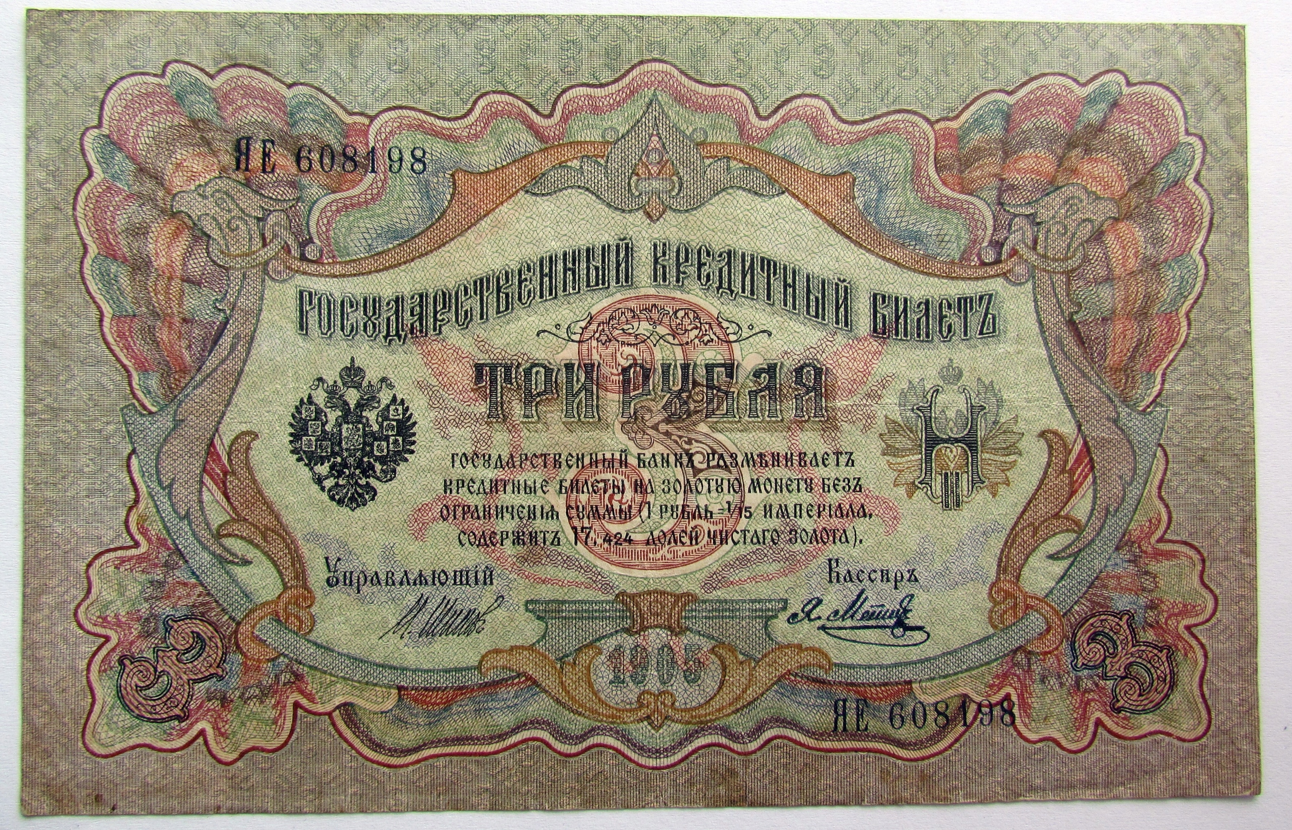 Предлагаю РОССИЙСКУЮ БАНКНОТУ 3 РУБЛЯ 1905 ГОДА, в хорошем состоянии, видно на прилагаемых фотографиях. Рекомендую.