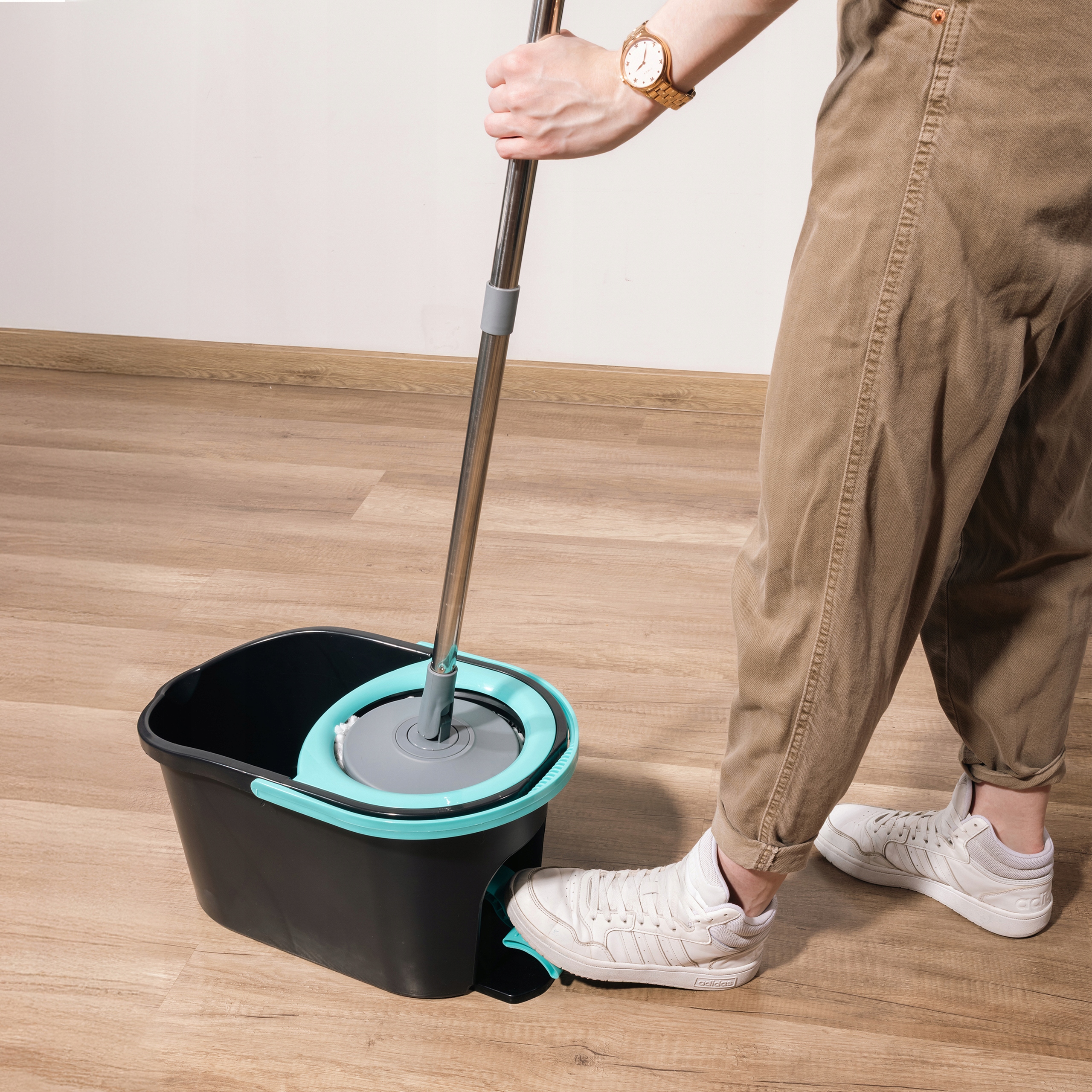 Вам больше не придется отжимать швабру вручную! Специально разработанный педальный механизм позволяет быстро и эффективно удалять лишнюю воду и грязь, благодаря чему полы сохнут быстрее, а уборка становится более комфортной. Педаль проста в использовании и позволяет точно контролировать влажность чистящего наконечника.