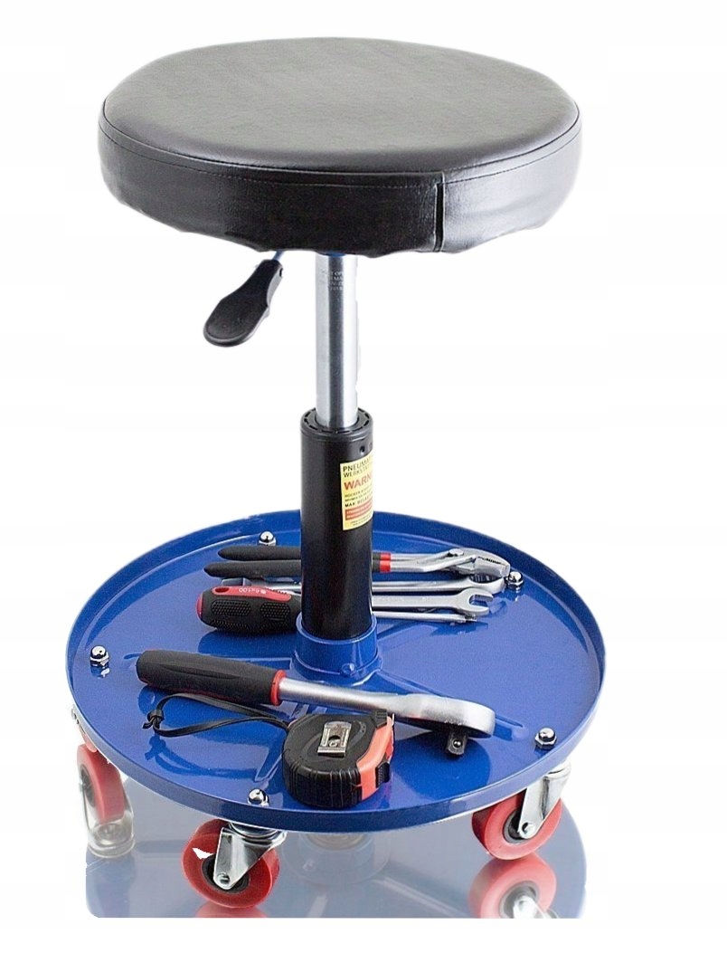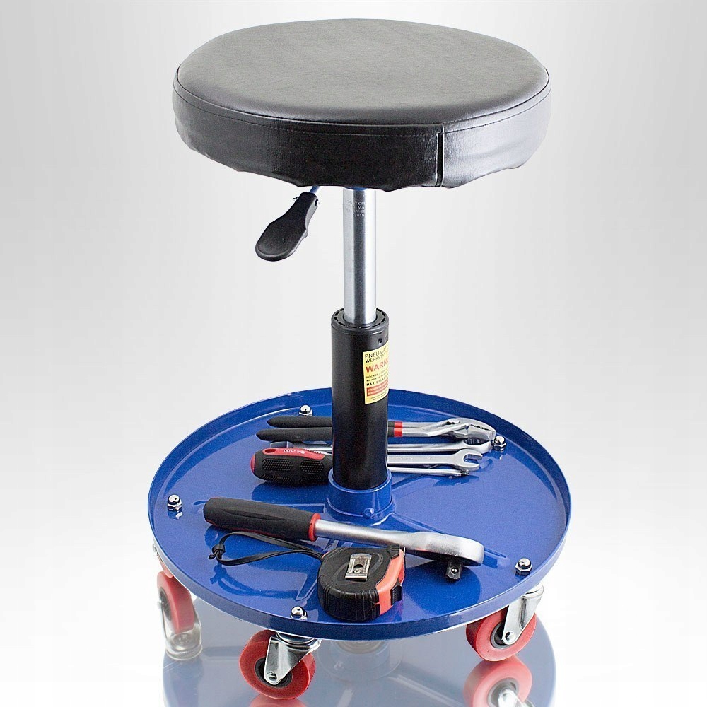 В основании находится контейнер для инструментов и аксессуаров, необходимых во время работы. Стул для мастерских пригодится во всех типах мастерских, сервисных центрах и гаражах. Поворотное сиденье позволяет пользователю занять удобное положение во время работы, а пять поворотных роликов повышают мобильность во время работы. Прочная конструкция позволяет выдерживать нагрузку до 135 кг и отличается привлекательным соотношением цены и качества.