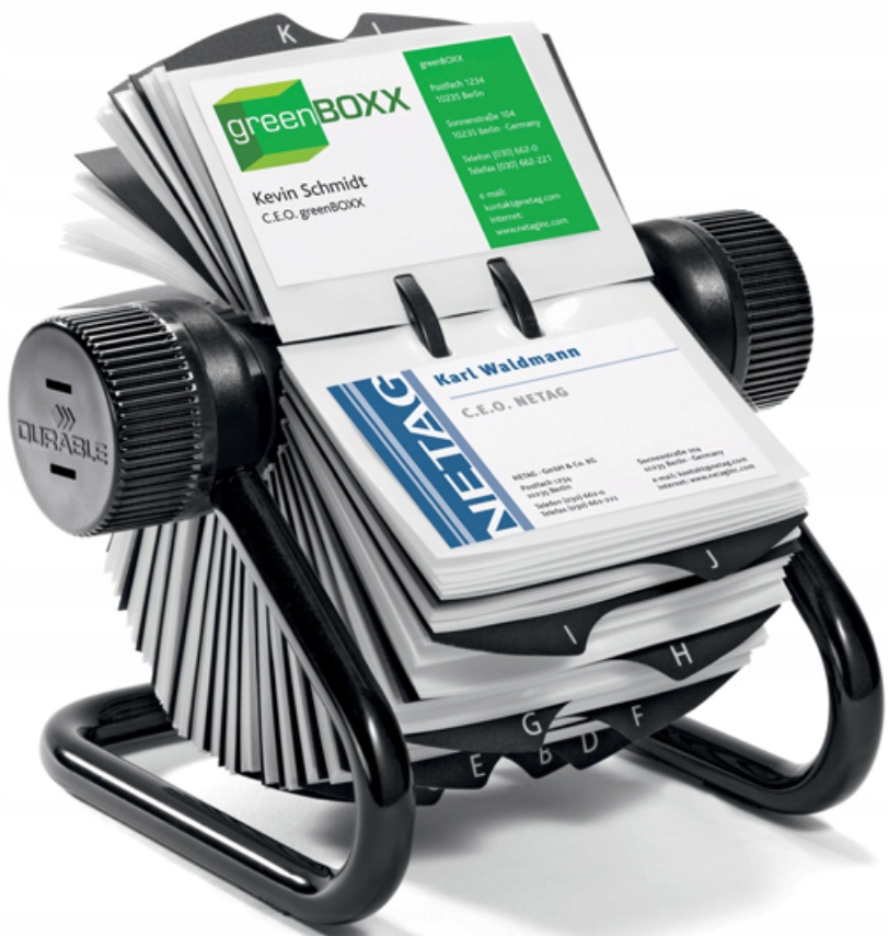 - Быстрый поиск визиток благодаря поворотному механизму.