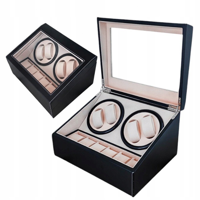 Элегантный ротатор для 4-х механических часов с автоматическим управлением Schalten Sie einfach den Rotator ein, um die Uhr zu drehen . Вращение включает 2 минуты в одном режиме, пауза - 6 минут, а также 2 минуты в другом режиме, пауза - 6 минут.