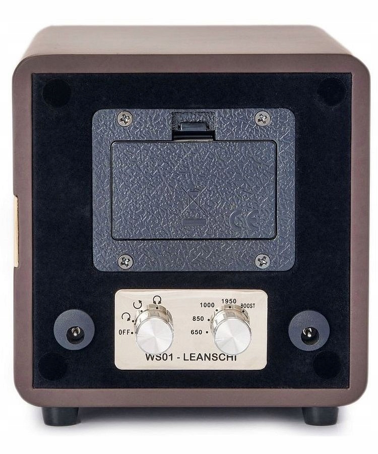 Ротатор Leanschi Brown and Ivory WS01-IVO2 вмещает 1 часы. Изделие изготовлено из коричневого дерева и бежевых вставок из эко-кожи. На корпусе цилиндра имеется тахометрическая шкала. Модель оснащена 3-мя режимами подзавода – правым, левым и попеременным, возможностью выбора суточного количества оборотов (650-1950) и программой наддува. Один блок питания переменного тока способен последовательно заряжать до 3 ротоматов.