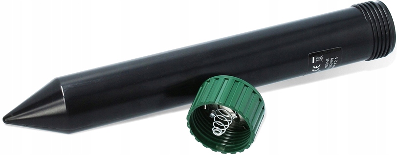 ▶ Открутите гайку и поместите батареи (предпочтительно щелочные) внутри устройства в качестве недостатка упаковки. Поверните гайку. Поместите в центре области, из которой мы хотим избавиться от родинок и грызунов. Не застряли и не встаньте в землю силой, в случае жесткой и компактной земли, подготовьте отверстие для устройства перед использованием соответствующего инструмента. После полока в почве необходимо снова затянуть гайку, чтобы обеспечить продукт с утяжкой.