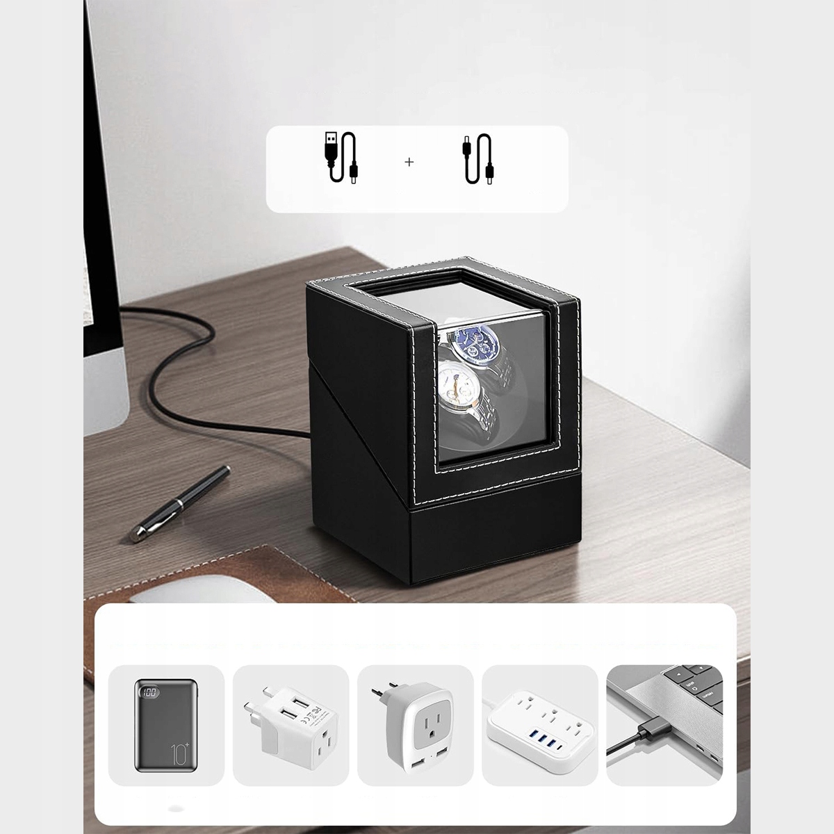 ✅ ✅ ✅Ротомат на 2 часа, заряжается через USB-DC, ротомат автоматический TPD 970-2430, два режима завода для часов с автоподзаводом, ротомат из искусственной кожи - черный.