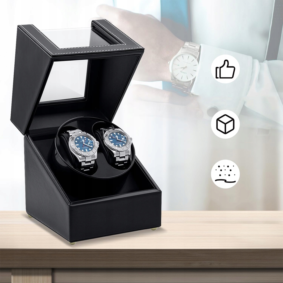 Корпус ротомата имеет прозрачное акриловое окошко и мягкую фланелевую подкладку, которая защищает часы от царапин и обеспечивает их длительную эксплуатацию. Изысканный дизайн делает ротомат не только функциональным, но и привлекательным дополнением.