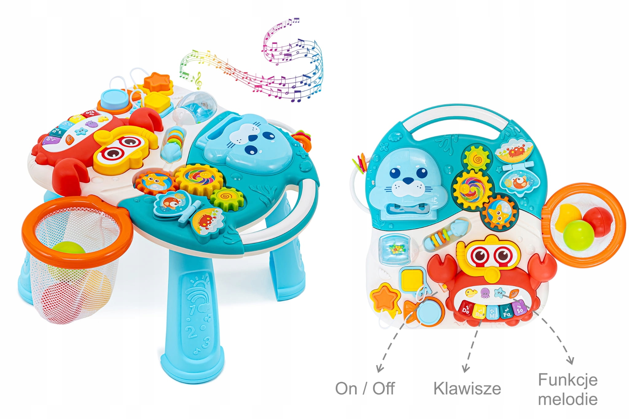 - Панель содержит красочное пианино, шестеренки, сортировщик форм и корзину для 3 пластиковых шариков, развивающие ручные навыки ребенка.