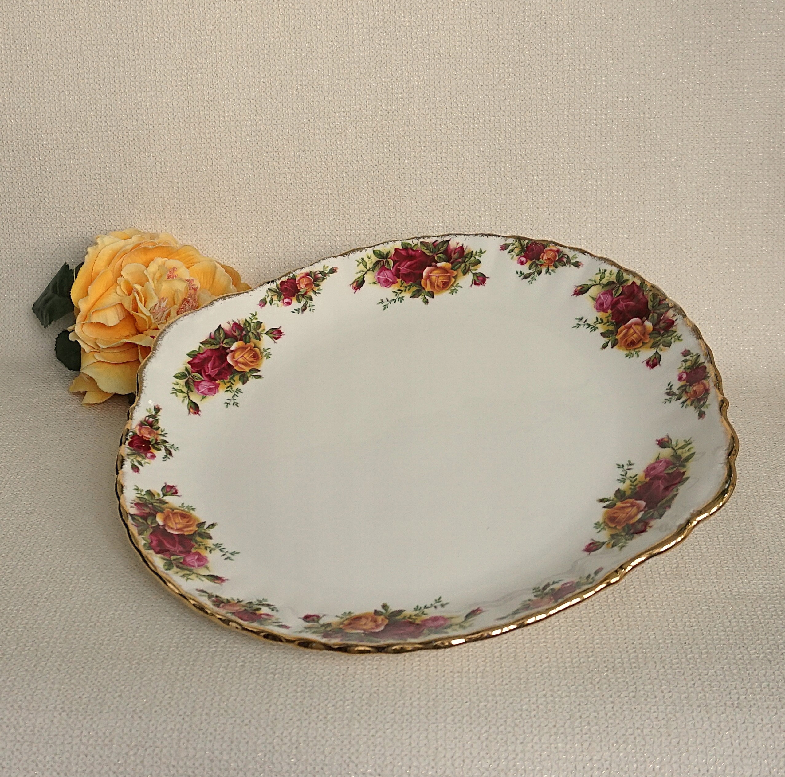 Рекомендую очень красивую, очень большую, привлекающую внимание тарелку с ручками, английской фабрики Royal Albert, линия Old Country Roses.