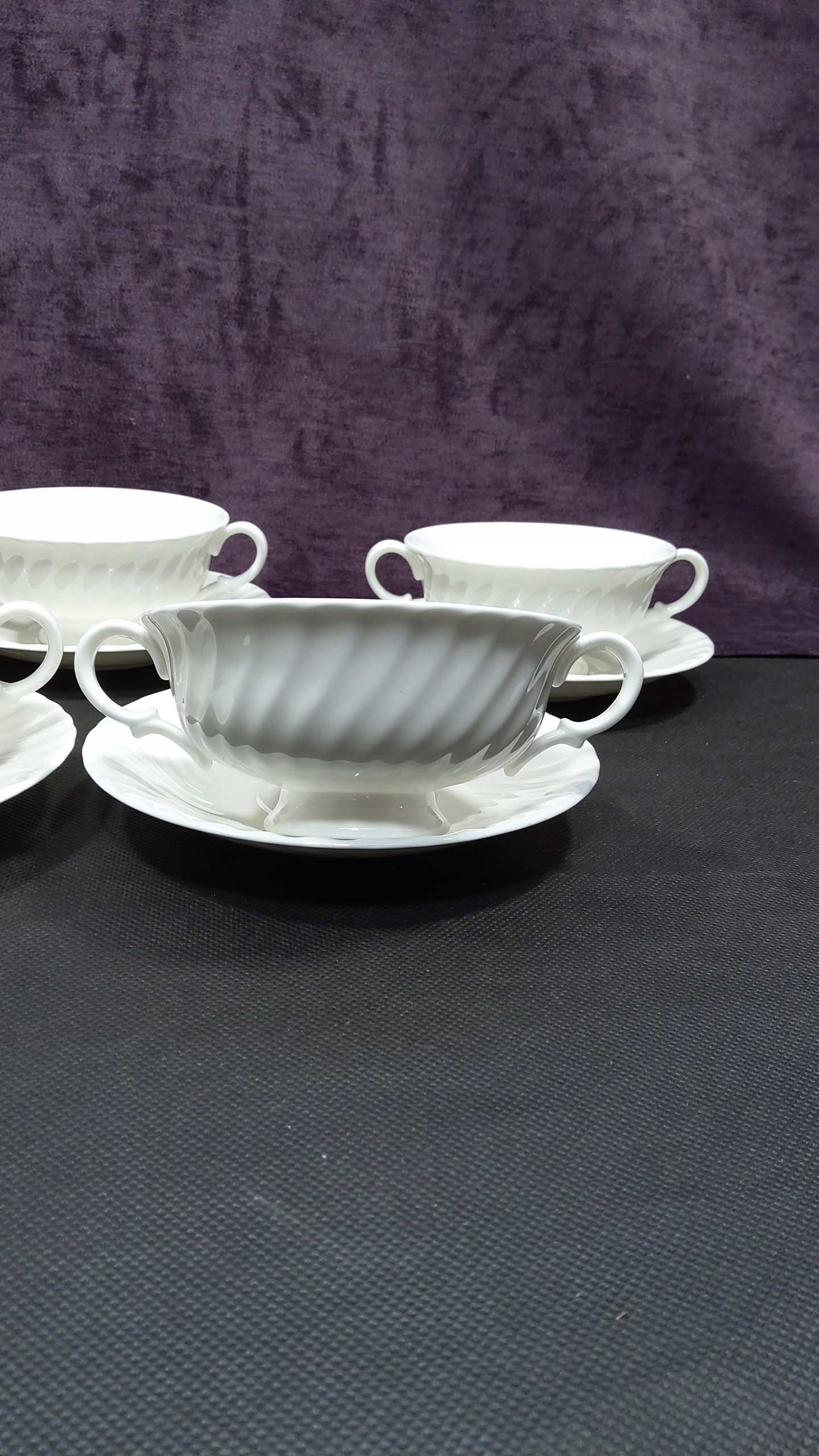 Английский, высококачественный костный фарфор. Набор из 5 бульонов с стендами от лейбла Royal Dulton, Cascade Cut. Белый фарфор, украшенный вихрями рельефами на бульонах и стойках. Очень хорошее состояние, без недостатков. Развертываемые ручки. Диаметр с ручками составляет 16 см, высота 6 см, стоит диаметром 16 см. Цена за 5 кл. Я рекомендую.