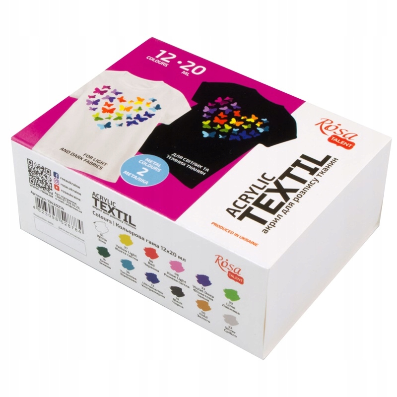 Акриловые краски с высокой пигментацией. Предназначен для рисования на светлых и темных тканях, таких как хлопок, кожа или замша. У них очень хорошее освещение, благодаря тому, что они также подходят для типичной живописи художественной ткани. Кремовая консистенция и правильный состав ингредиентов делают краски идеально работать на упругих тканях. Чтобы починить краски, гладьте ткань в течение 5 минут. Если гладение невозможно, вы можете положить в духовку на 20 минут на температуру 120 ° С после фиксации, подождите за 48 часов до возможного мытья.