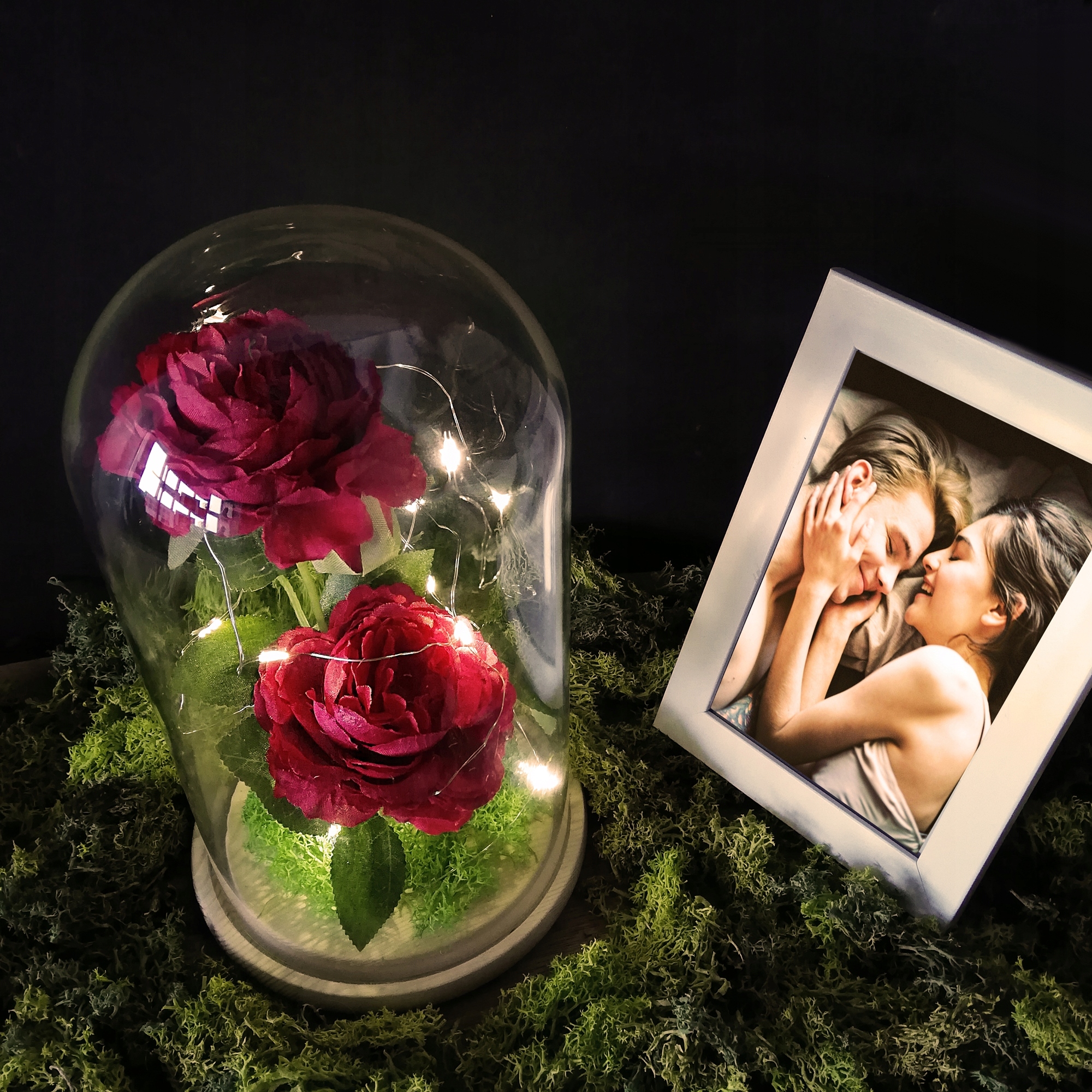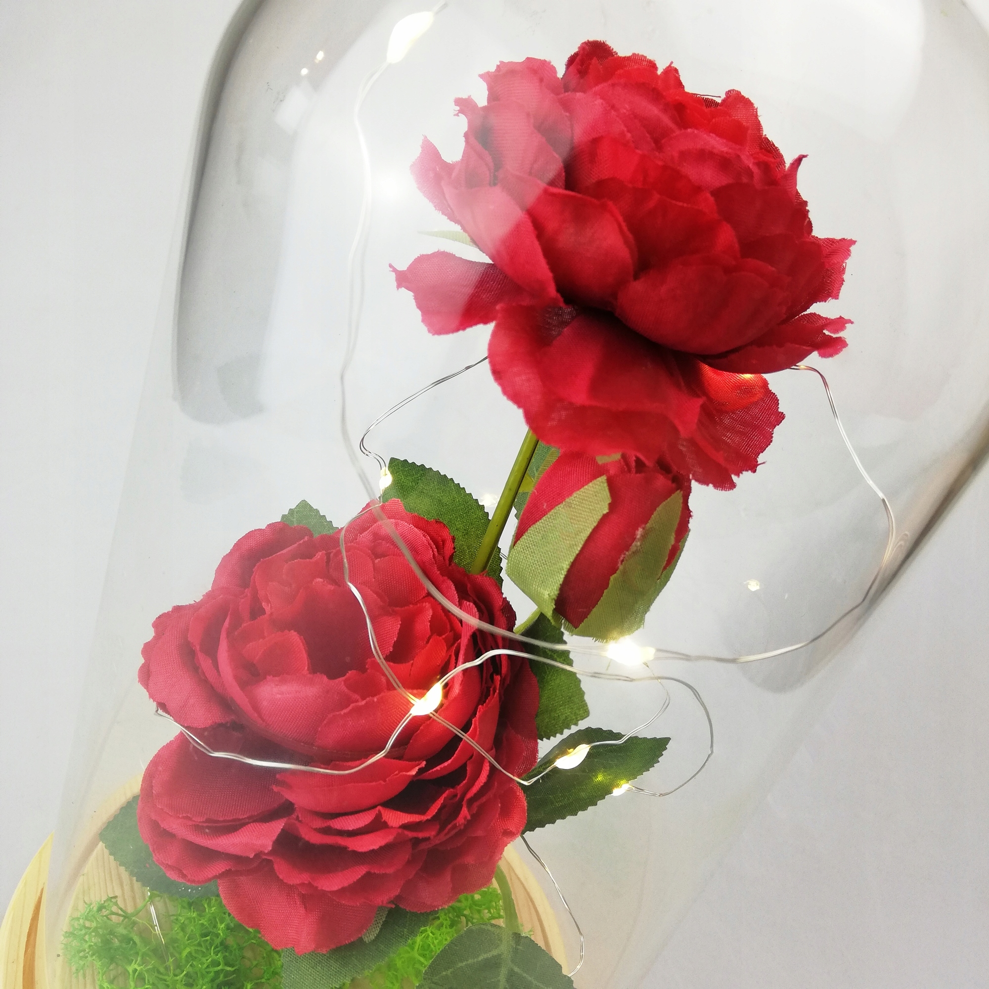 Чудесная роза, заключенная в стеклянный купол. Подсветка внутри цепочкой со светодиодными лампами. Роза помещается на деревянную подставку.