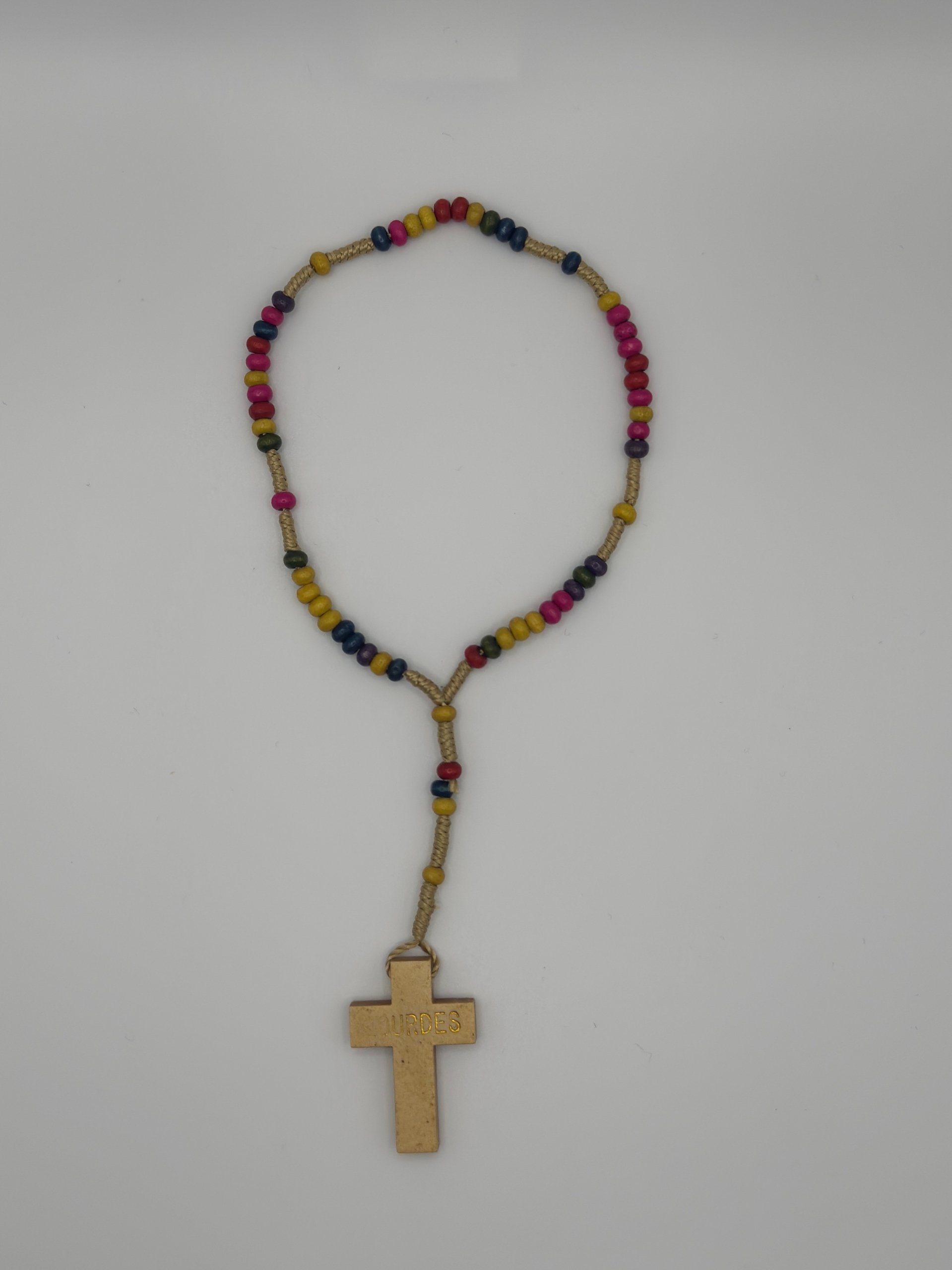 для продажи красивого деревянных розария на шнуре 20 см в длину. Сделано из красочных бусин, которые придают ему уникальный характер и радостный вид. Легкий, удобный, идеально подходит для ежедневной молитвы, для подарка или в качестве религиозного сувенира.
