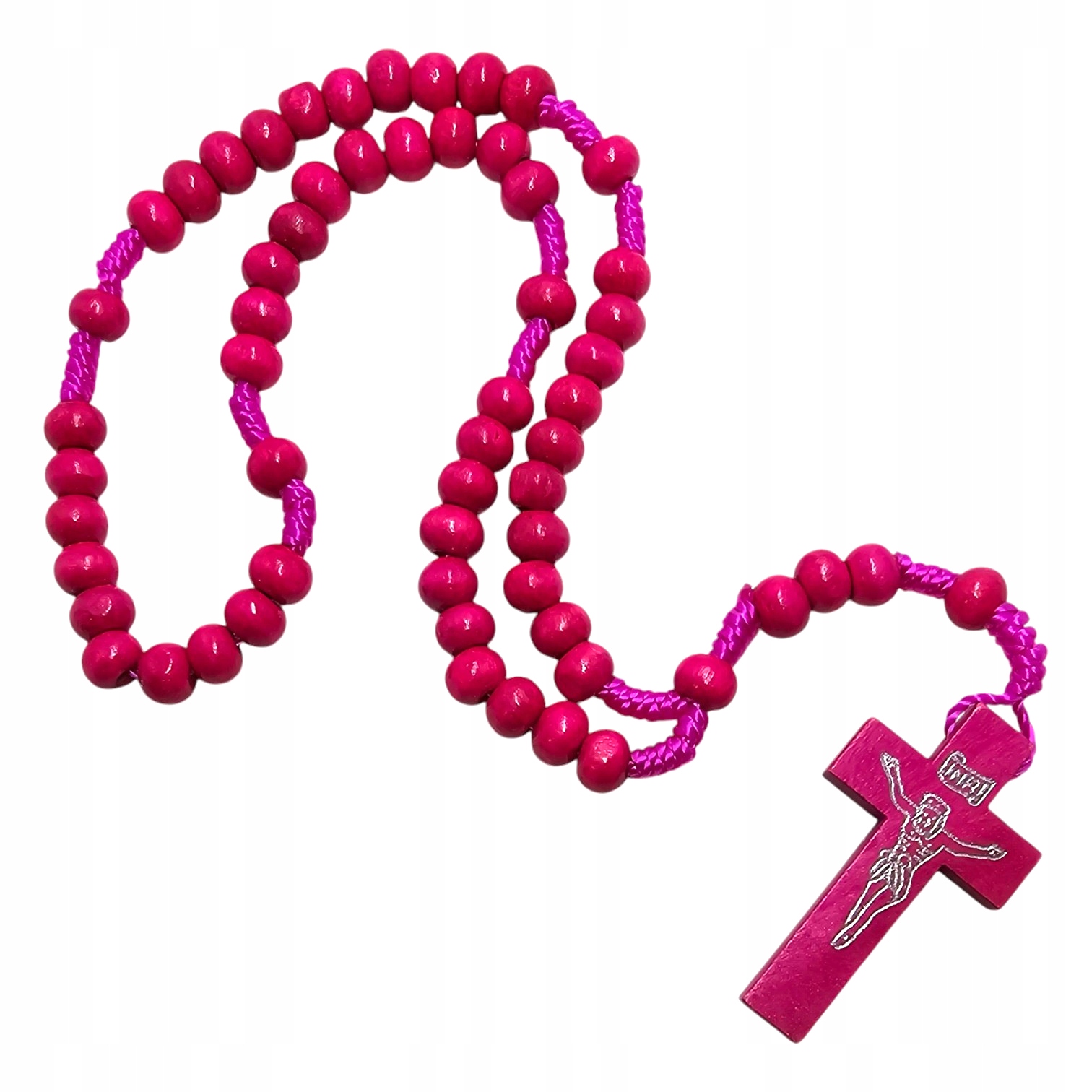 Элегантные четки из натурального дерева интенсивного розового цвета. Ее длина 28 см, диаметр бусин 7 мм, что делает ее удобной и удобной для молитвы. Центральным элементом четок является простой деревянный крест размером 42х24 мм, что придает ему характерный вид. Бусины связаны прочной разноцветной нитью. Этот страстный цвет и натуральный материал делают эти четки уникальным предметом веры и молитвы.