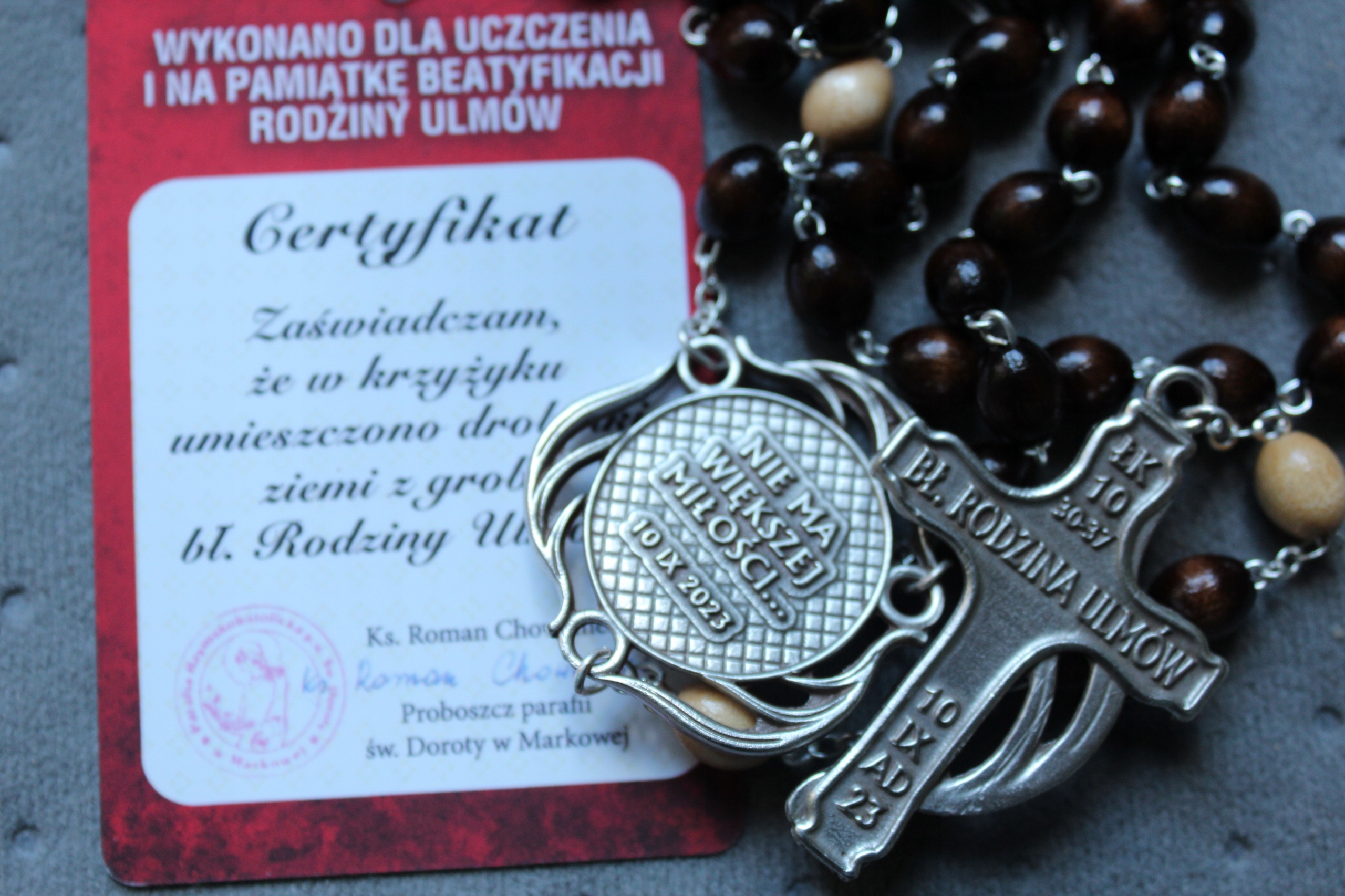 - Розарийский крест еще более уникальный. Это в нем, из -за мученичества Ульмы, а не в медаль, так как это обычно делается с розариями с реликвиями, религиозной бывшей, были размещены частицы земли из могилы благословенной семьи. Над ними находится надпись IHS, символизирующая Иисуса Христа, и лучи, выходящие из надписи непосредственно на землю, которые покрывали временные останки мучеников от Маркова.