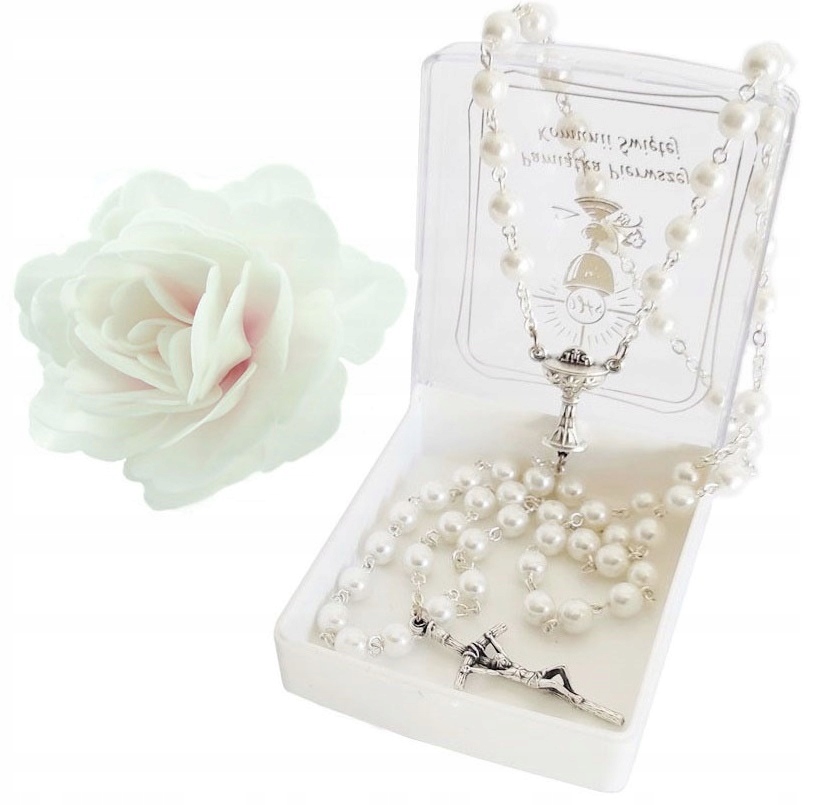 Красивые четки, сверкающие как при дневном, так и при искусственном освещении, помещены в коробку с золотой надписью «Первое Святое Причастие» и чашу IHS.