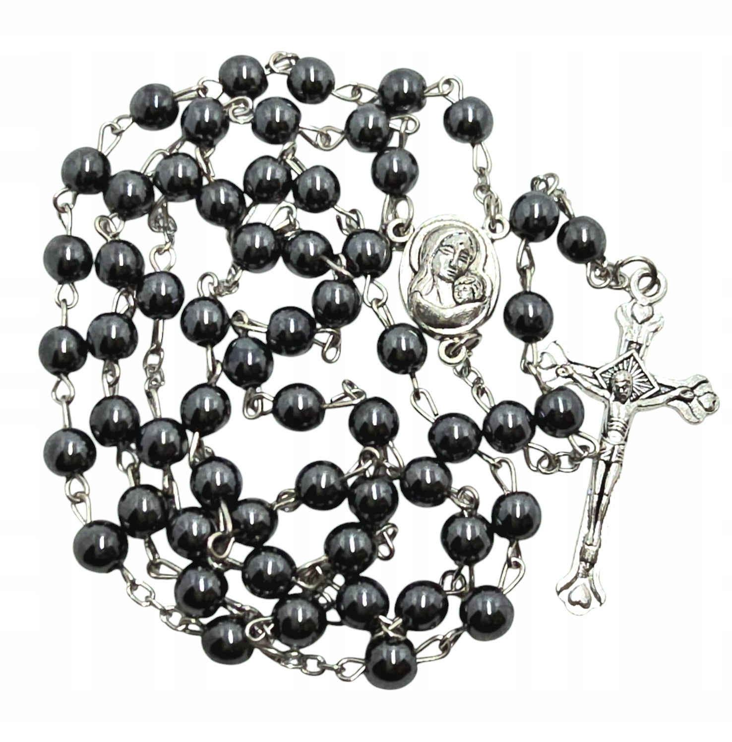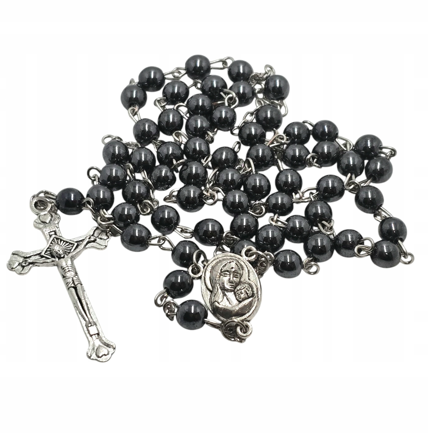 Откройте для себя красоту молитвы с этим уникальным серым розарием, сделанным из гематита. Его тонкий блеск и элегантный вид делают его идеальным для ежедневной молитвы, а также как уникальный дар. Розарий украшает разъем изображением матери Божьей и прекрасным крестом, который дает ему уникальный характер. Изготовленный из высококачественного гематита и металла, он обеспечивает долговечность и комфорт использования. Продается в практической пластиковой коробке, защищая от повреждения.