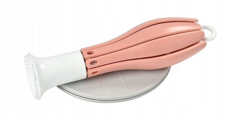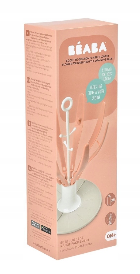 Практическая складная сушилка для бутылочек и других аксессуаров для кормления от французского бренда BEABA. Подходит для всех моделей бутылочек, доступных на рынке. Имеет интересный, дизайнерский вид - на светло-сером подносе расположен белый ободок с круглой ручкой вверху и четырьмя короткими, напоминающими тычинки внутри цветка, держателями для аксессуаров. Вокруг оголовья расположены 8 длинных пастельно-розовых держателей для бутылок, напоминающих лепестки цветов. В каждом втором кронштейне имеется дополнительная вставка для более мелких аксессуаров или элементов бутылочек, таких как соски, колпачки, крышки и т. д. Эргономичная форма облегчает циркуляцию воздуха, поэтому вещи быстро сохнут и не занимают много места на кухонной стойке. Вода капает на съемную силиконовую основу. Все это было разработано для обеспечения максимально возможной гигиены и комфорта использования. Подставка для сушилки легко складывается одной рукой. Все элементы можно мыть вручную или в посудомоечной машине