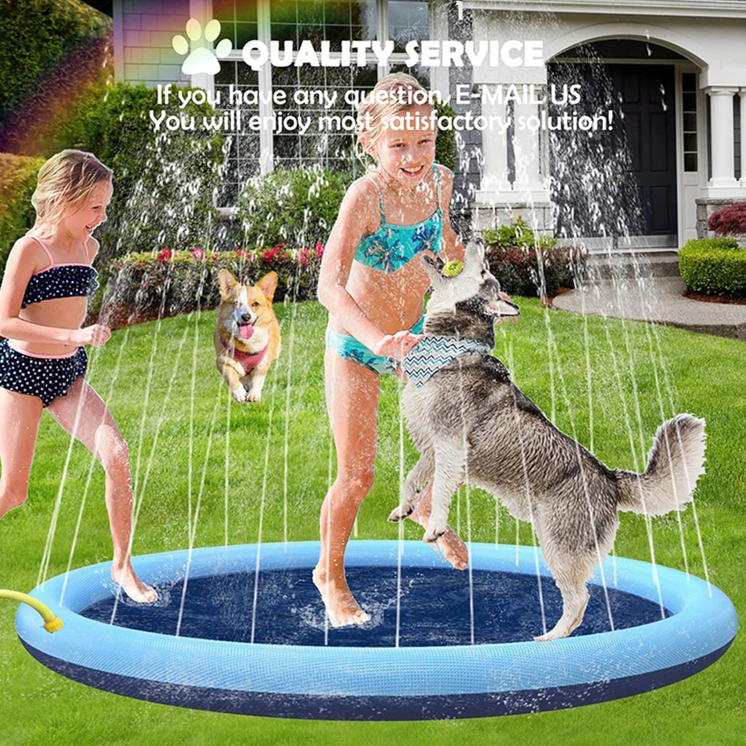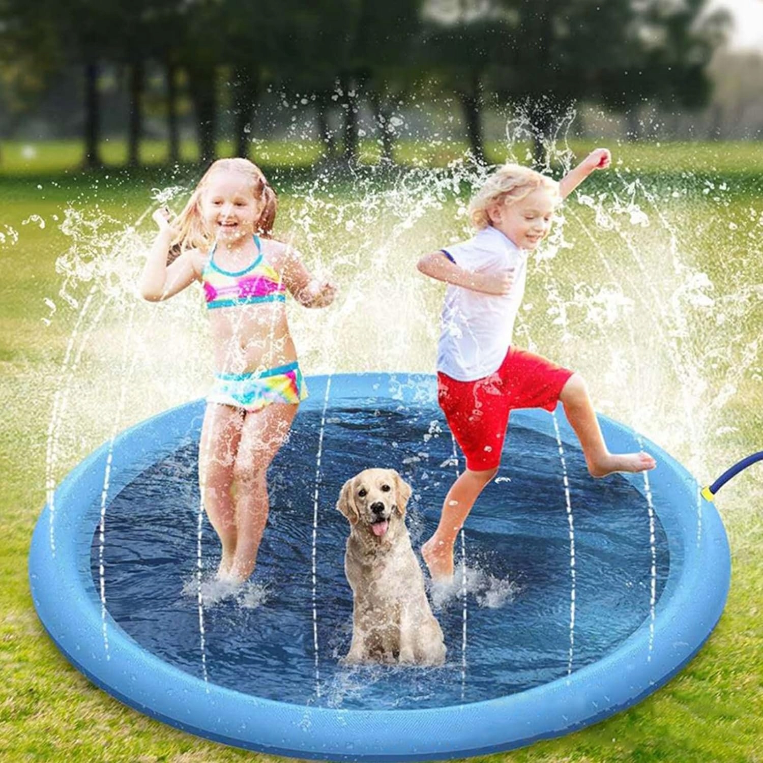 Разбрызгиватель Summer Fun Идеальный летний сюрприз: вашему ребенку или собаке понравится этот разбрызгиватель в качестве подарка. Дети могут весело играть на водном коврике и устранить проблемы, вызванные жарой. Вы можете полностью расслабиться, не посещая аквапарк, и просто поиграть в саду. Веселый и динамичный аквапарк может быстро улучшить отношения между родителями и детьми. Безопасный и прочный Наш надувной спринклерный бассейн для собак безопасен, нетоксичен, не содержит бисфенола А и не имеет запаха, поэтому не причиняет вреда малышам и детям. Он изготовлен из высококачественного, экологически чистого ПВХ-материала, который достаточно прочен, чтобы дети могли играть снова и снова. Нескользящая конструкция Поверхность нашей посыпки имеет нескользящую текстуру, которая обеспечивает лучшее сцепление с поверхностью и удобство для детей и домашних животных, обеспечивая при этом безопасность. Пусть домашние животные и дети веселятся. Легко настроить Просто подсоедините разбрызгиватель с водяной подушкой к стандартному садовому шлангу или трубе из ПВХ и просто отрегулируйте давление воды, чтобы увеличить или уменьшить высоту и направление струи. При использовании мягкой подушки следите за тем, чтобы бассейн был прямым и ровным, а на земле не было острых предметов. Легко переносить и хранить. Этот небольшой бассейн можно сложить, легко транспортировать, легко хранить, и вы можете взять его с собой, собаками и домашними животными.