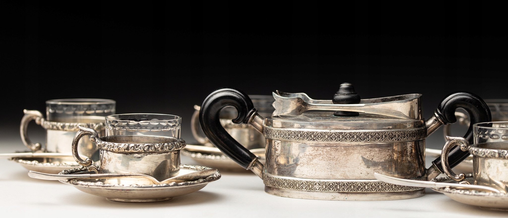 Чрезвычайно декоративный кофейный сервиз, полностью выполненный из серебра 800 пробы.Набор состоит из овального серебряного подноса, украшенного растительным орнаментом, шести серебряных блюдец, шести серебряных корзин для чашек, шести стеклянных вставок, серебряной сахарницы. миска, шесть серебряных ложек и серебряные щипцы для кубиков сахара. Корзины и блюдца украшены растительным орнаментом, а также украшены ручками. Вставки выполнены из бесцветного стекла с полированной розеткой внизу и полированным декором по верхнему краю. Тулово украшено двумя полосами с розеточным орнаментом, боковые ручки и верхняя ручка выполнены из черненого дерева. Ложки кофейные, гладкие, с лопаточной ручкой. Щипцы для кубиков сахара с характерным трехгранным наконечником.