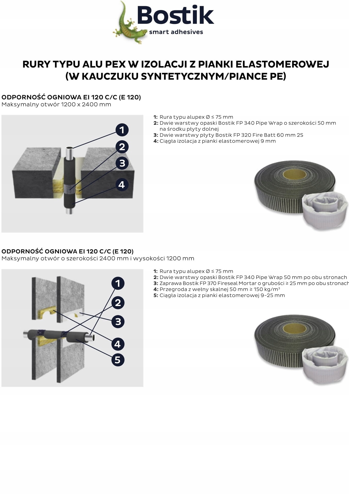 Bostik FP340 PipeWrap — это эластичная лента, которая значительно расширяется при случай пожара. Каждая лента состоит из реактивной огнестойкой ленты на основе графита, которая в случае пожара реагирует с помощью тепла, закрывая отверстие, оставленное пластиковой трубой или легковоспламеняющейся изоляцией трубы. Ленту устанавливают вокруг трубы или утеплителя внутри перегородки, закрепляя ее, например, скотчем. Пространство вокруг ленты заполнено плитой Bostik FP 320 Fire Batt, а стыки герметизированы вспучивающимся акрилом Bostik FP 310. Отверстие вокруг обшивки также можно заполнить огнестойким раствором Bostik FP370.