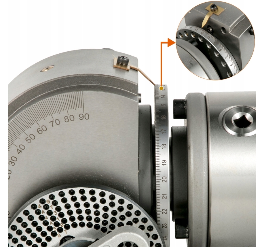 Оснащен поворотным столом и индексирующим шпинделем, а две ручки с прецизионными шкалами позволяют более точно устанавливать угол.
