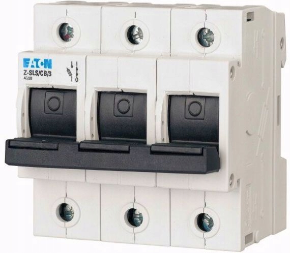 Выключатель с предохранителем Z-SLS/CB/3 компании Eaton используется для защищать электроустановки от воздействия коротких замыканий и перегрузок. Выключатели-разъединители оснащены плавкими вставками типа DO2. Характерной особенностью выключателей является способность отключать токи короткого замыкания и срабатывания, а также создавать видимый изоляционный зазор после снятия вставок. Благодаря использованию плавких вставок устройство идеально подходит, например, для защиты счетчиков или для защиты ограничителей перенапряжения. Применяются в главных распределительных щитах, промышленных энергоустановках и распределительных сетях. Изделие маркируется производителем каталожным номером 248249. Устройство представляет собой модульное устройство и монтируется на монтажную рейку TH35. Выключатель рассчитан на три плавкие вставки и имеет 3 отключаемые токопроводящие линии. Максимальный номинальный ток для данного типа устройств составляет 63А.