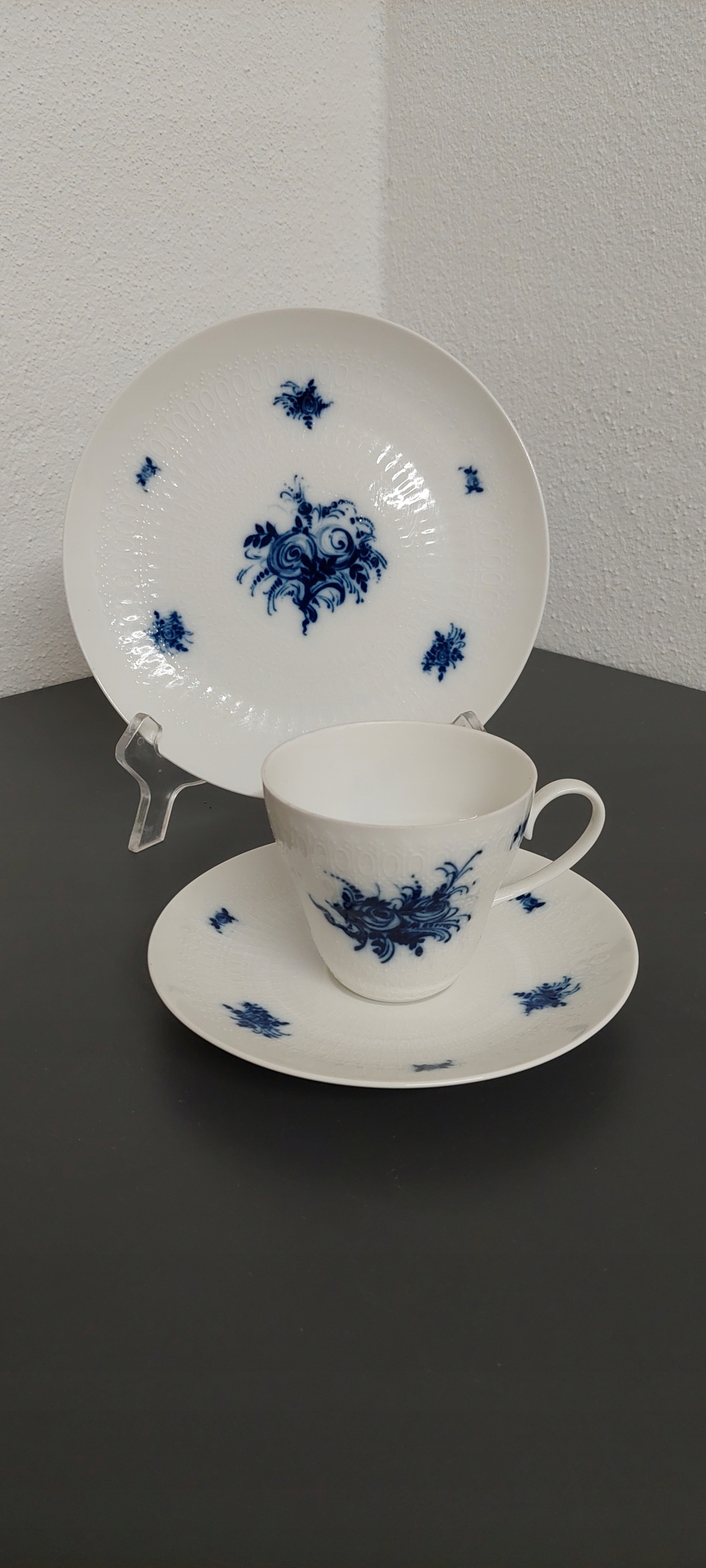 Трио Розенталь в белом с кобальтом в очень хорошем состоянии с размерами, высота чашки 7,5 см, диаметр чаши 8 см, диаметр пластины под чашкой 15,5 см, диаметр десертной пластины 19 см.