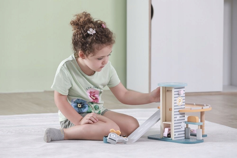 Деревянная трехуровневая парковка – мечта каждого маленького автолюбителя. Теперь вы можете покатать лесных животных. Набор приобретает очарование благодаря четырем дополнительным транспортным средствам. На каждом из них изображено животное. На парковке также есть вертолетная площадка, автомойка и заправка. Изделие изготовлено из дерева и окрашено безопасными, нетоксичными красками. Прочные материалы, которые гарантируют удовольствие на долгие годы.