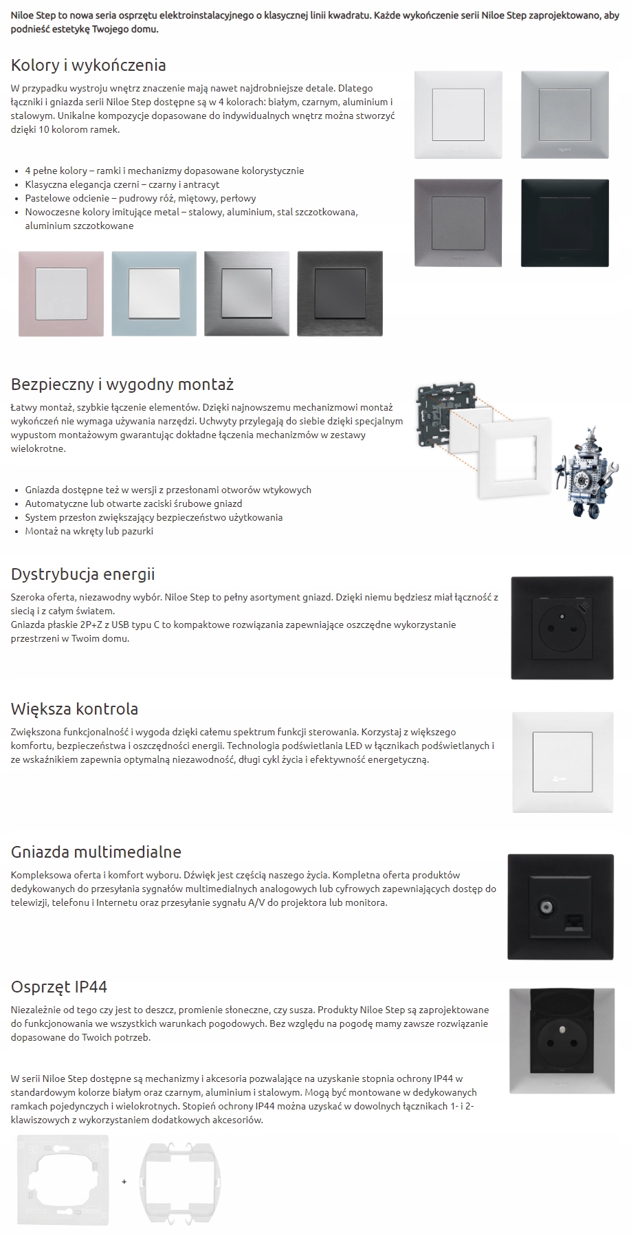 Niloe Step был разработан для улучшения эстетики интерьера. Отделка отличается вечной привлекательностью черного цвета и классической квадратной линией. Выключатели и розетки доступны в следующих цветах: белый, черный, алюминий и сталь.Серия позволяет выбрать собственную композицию из 10 цветов корпуса и 4 цветов механизма, что позволяет подобрать ее элементы к индивидуальному оформлению помещения. р>