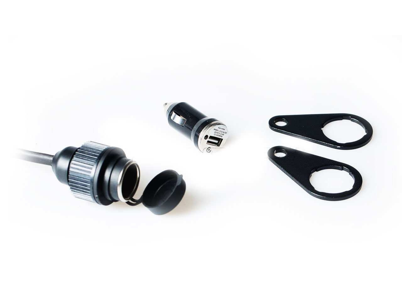 - в комплект входят два кронштейна для крепления розетки на руль с диаметр 22 или 28 мм и шаг крепления винтов 30-40,5 мм,