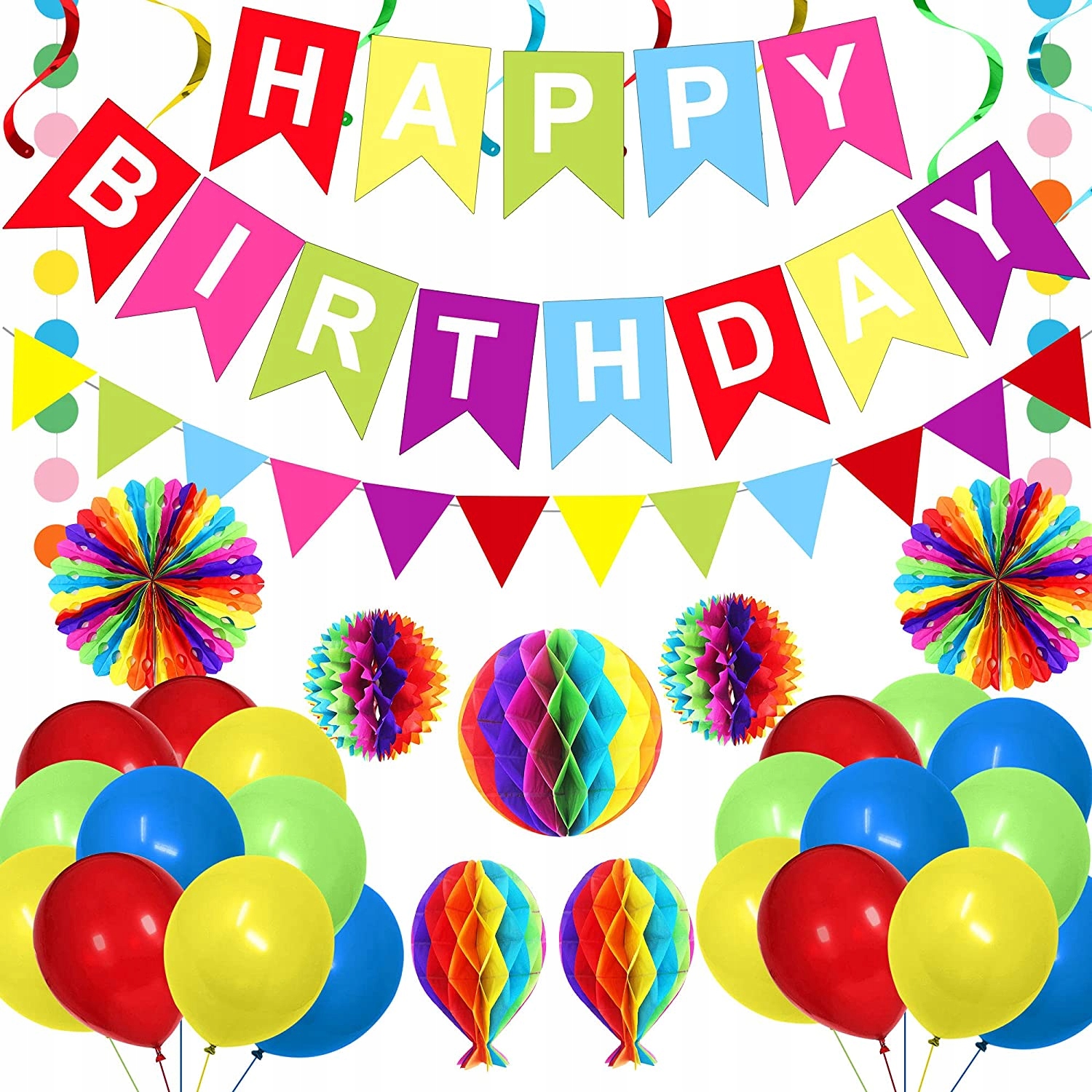 Набор красочных украшений для дня рождения: В украшениях для дня рождения есть все необходимое для украшения вечеринки по случаю дня рождения. В этот набор входят: Воздушные шары (5*зеленых + 5*синих + 5) *Желтый + 5*красный), 1 баннер с Днем Рождения, 1 треугольная овсянка, 1 гирлянда из круглых точек, 1 сотовый шар, 2 сотовых воздушных шара, 2 красочных бумажных веерных цветка, 2 сотовых шара, 8 подвесок Вихрь.