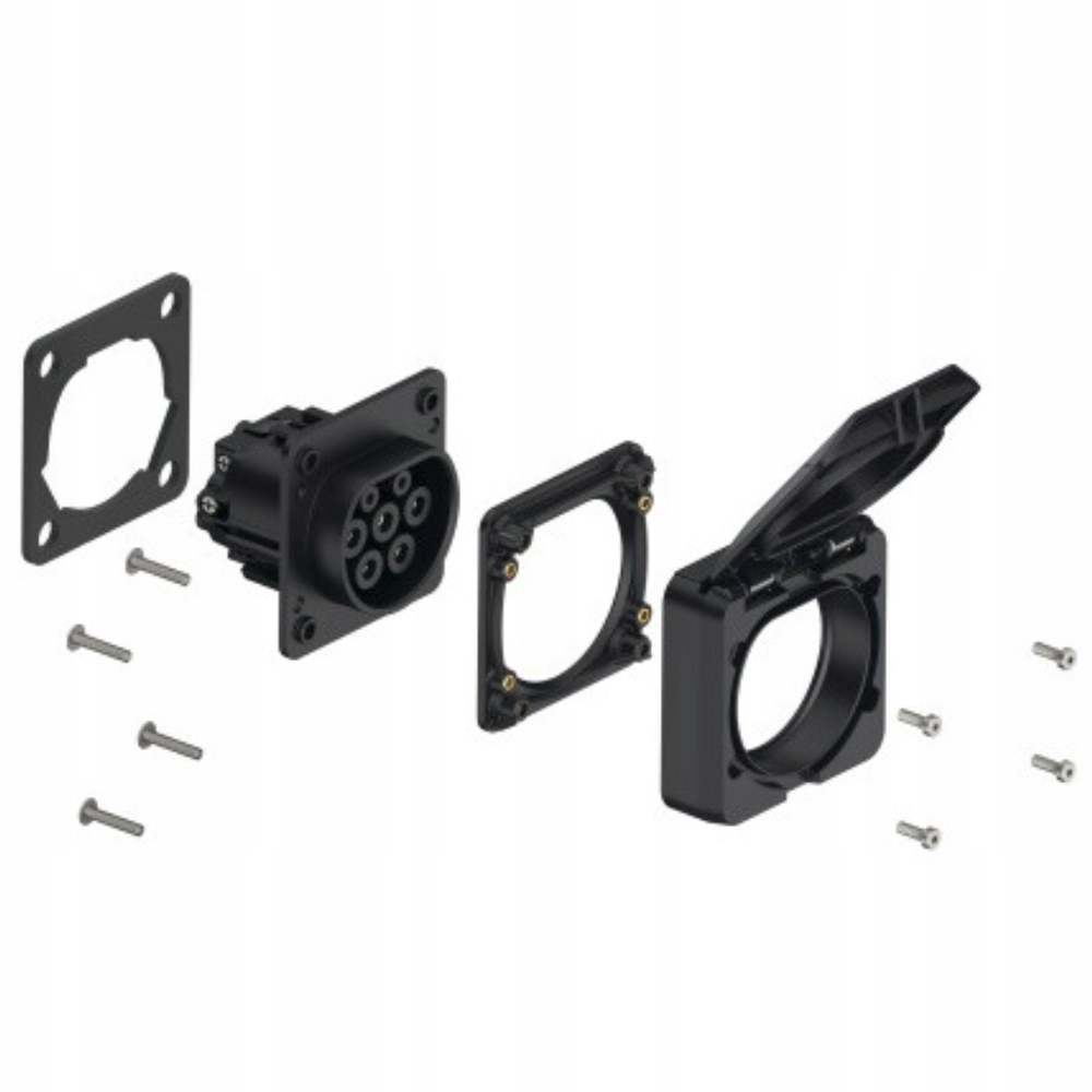 ➡️ Розетка типа 2 для зарядка электромобилей (ЭМ) переменным током (АС) состоит из: розетки накладной тип2 (АС 32А) (контакты винтового крепления, никелированная латунь), рамы с самозакрывающейся откидной крышкой, промежуточного фланца, фланцевой прокладки, крепежные винты
