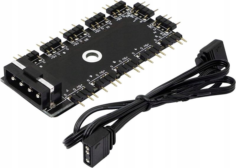 Разветвитель концентратора используется для распределения сигнала aRGB. Он может отправлять сигнал на двенадцать элементов aRGB. Он совместим с элементами aRGB с 3-контактным разъемом aRGB. Питание берется из порта MOLEX. К разветвителю можно подключить продукты aRGB, такие как подсветка вентиляторов, светодиодные ленты aRGB или подсветки с водяным охлаждением. С обратной стороны адаптера имеется клейкая лента, которая легко и надежно приклеит плату к корпусу компьютера. В комплект входит кабель aRGB для подключения к материнской плате.