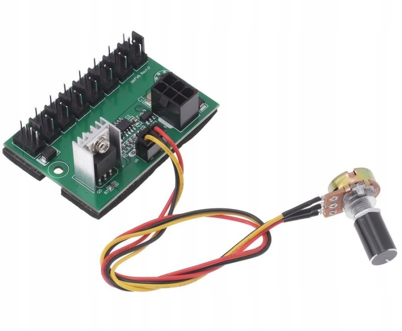 Распределитель, позволяющий подключить до 8 вентиляторов 3/4 PIN. Он имеет 8 4-контактных разъемов и питание от 6-контактного порта PCI-E. Одна ручка для регулировки скорости. Вентиляторы можно отключить, диапазон регулировки скорости 0–100%. С обратной стороны адаптера имеется клейкая лента, которая легко и надежно приклеит плату к корпусу компьютера. Для правильной работы контроллера требуется, чтобы используемые вентиляторы имели функцию регулирования ШИМ. Длина кабеля с ручкой: 30 см.
