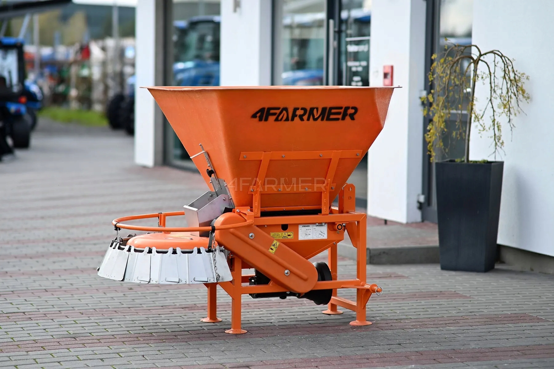 Разбрасыватель удобрений весит 130 кг, а допустимая масса нагрузки составляет от 200 до 400 кг в зависимости от трактора. Рабочий орган представляет собой горизонтально расположенный вращающийся диск с вертикальными лопастями, который, вращаясь, разбрасывает материал на расстояние от 5 до 8 м (без насадки), в зависимости от типа используемого посевного материала.