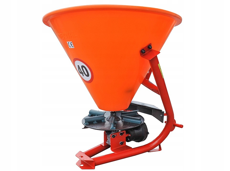 Разбрасыватель подготовлен к работе на максимальных уклонах местности, не превышает 8 градусов b>. Разбрасыватель песка приводится в движение ВОМ трактора. Удобрения и сыпучий материал дозируются с помощью вращающегося диска через два отверстия, расположенных в нижней части бункера.
