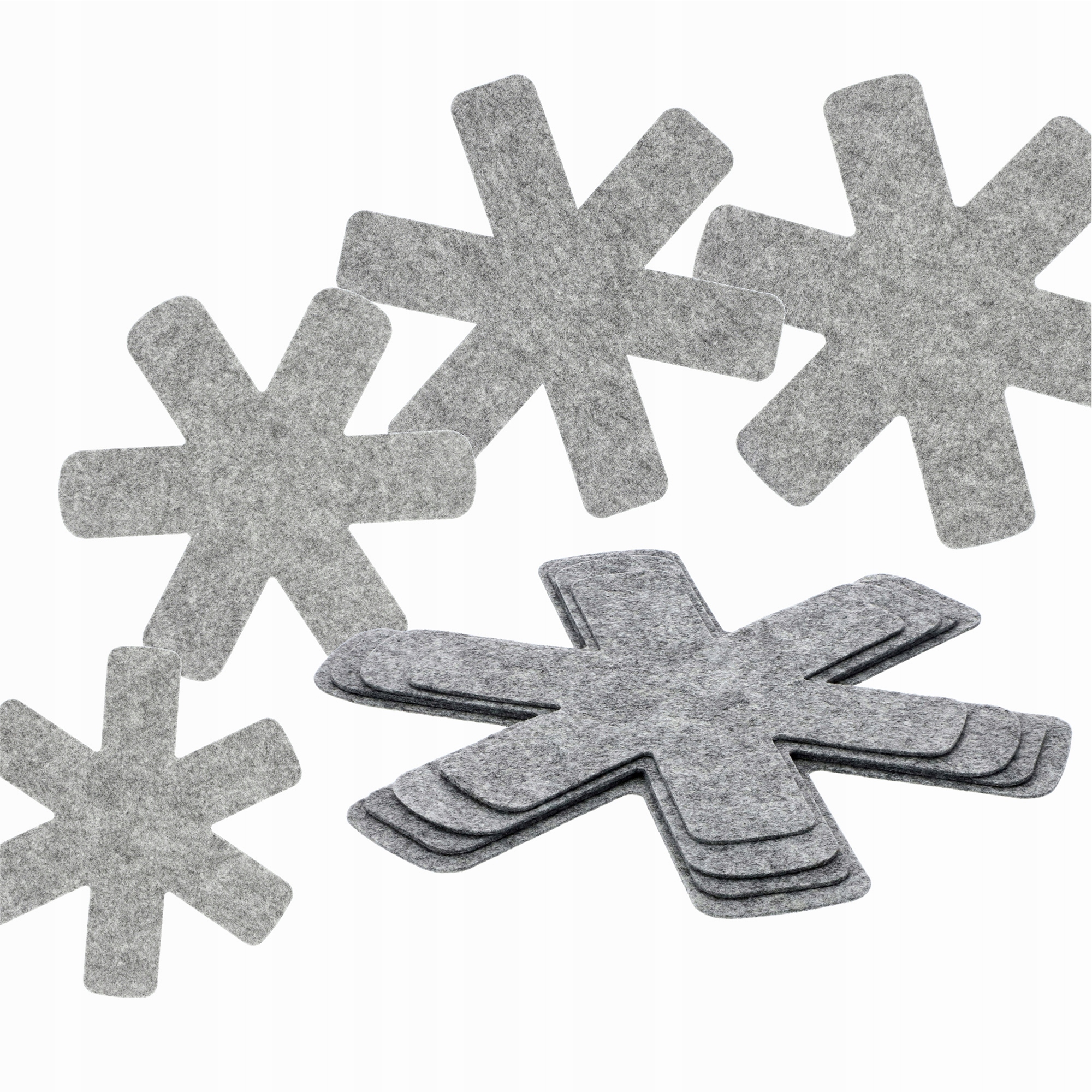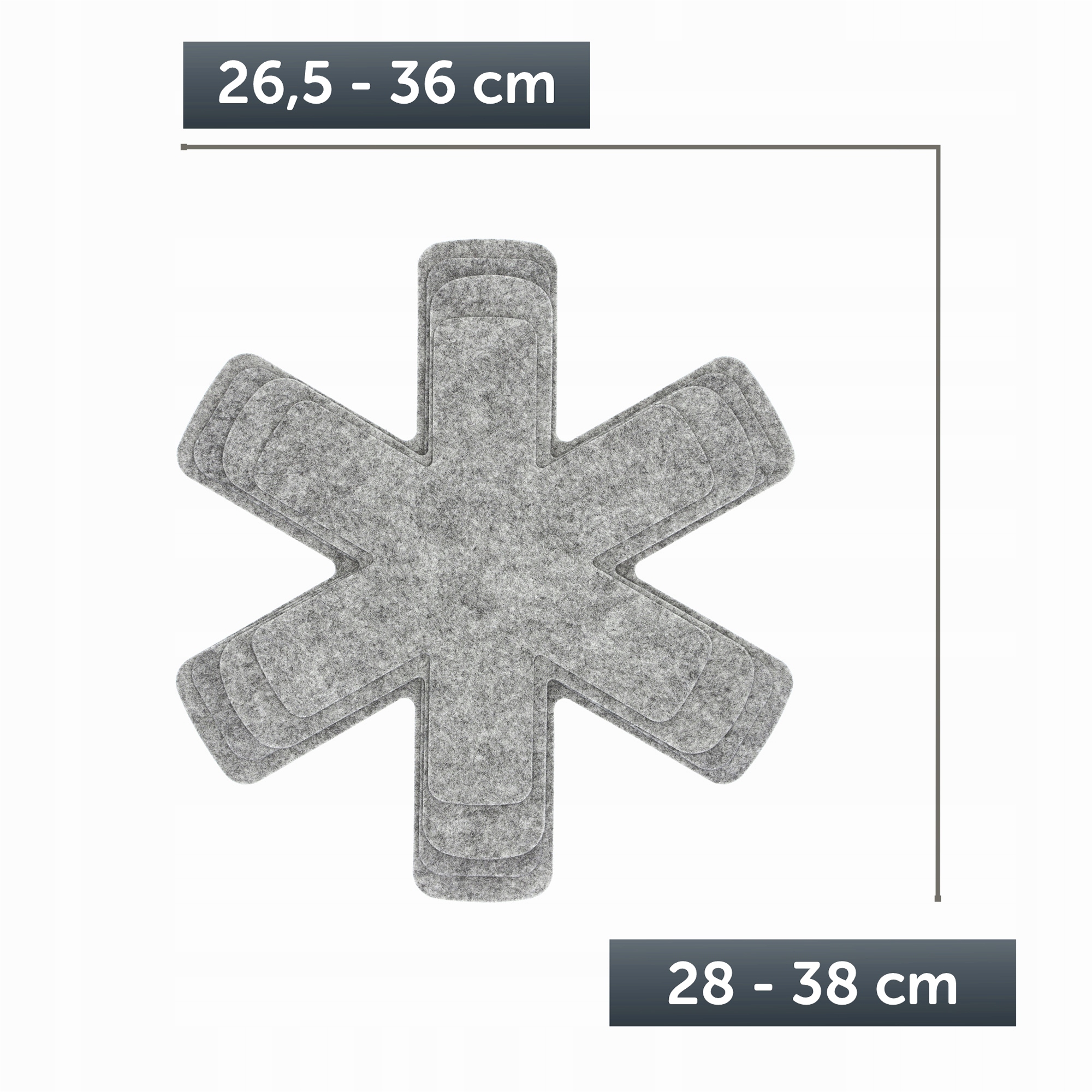Большим преимуществом нашего продукта является то, что он быстро сохнет, поэтому даже если мы поместим его под еще не высохшую кастрюлю или влажную сковороду, это не приведет к потере свойств прокладки. Изделие устойчиво к вредному воздействию грибков и моли, которые любят бродить по кухонным шкафам. Доступный цвет проставки — серый. В наборе четыре размерных варианта: 28 см, 33 см, 35 см, 38 см.