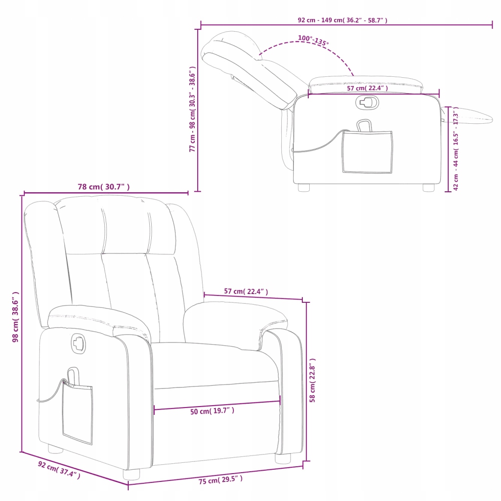 - Размеры в сидячем положении: 78 х 92 х 98 см (Ш х Д х Г). высота)