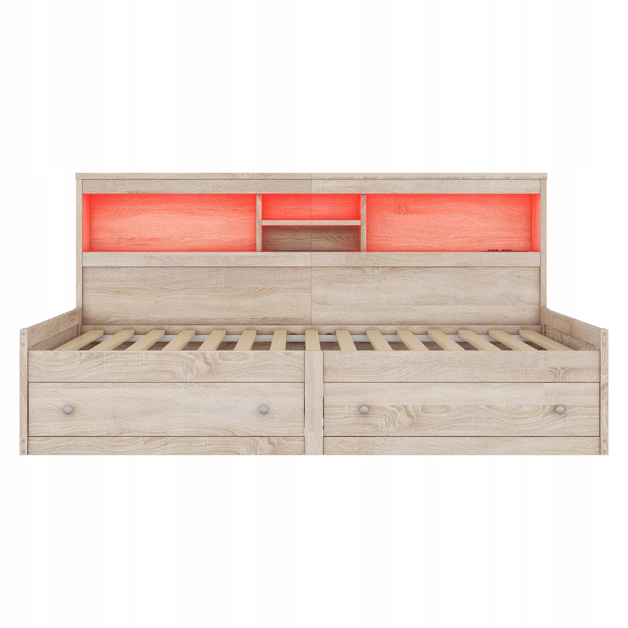 Диван, тахта 90*200см, диван-кровать, прикроватная тумбочка, кровать с 2 розетками USB и 2 розетками для зарядки, рассеянное освещение, кровать с двумя ящиками, кровать с реечным каркасом (без матраса), ДСП, натуральный цвет