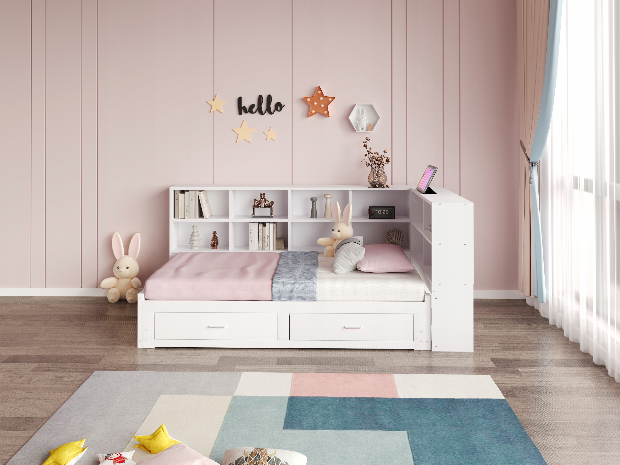 Диван из массива 90/180*190см, с выдвижной кроватью, местом для хранения вещей, многофункциональной евророзеткой, выдвижными ящиками, реечный каркас, многофункциональная деревянная односпальная кровать, белый