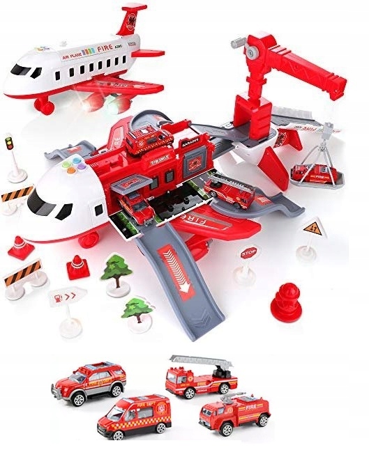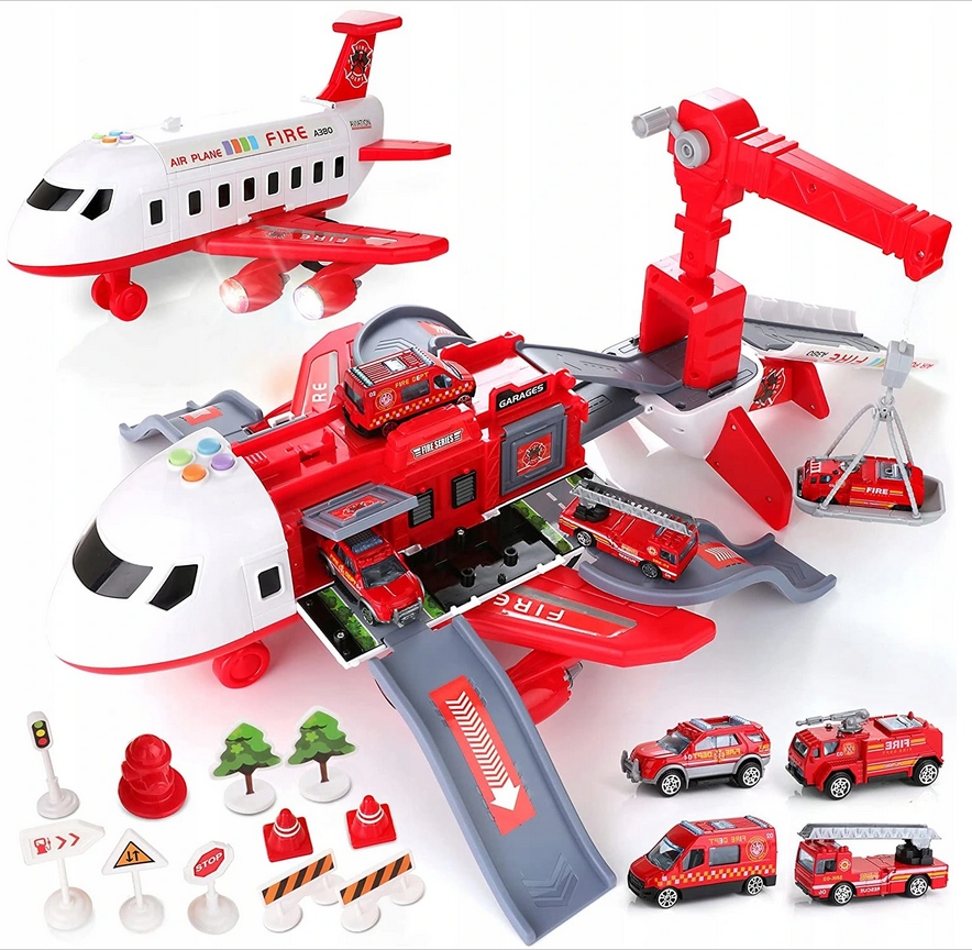 Большой складной самолет, в раскрытом виде которого размещается пожарное депо с многочисленными аксессуарами. Он имеет световые и звуковые эффекты, которые активируются с помощью 4 кнопок, расположенных в верхней части самолета. Этот красивый, большой самолет имеет длину 65 см. Изделие оснащено приводом, после вытягивания и отпускания плоскость будет двигаться по полу. Изделие очень легко и быстро трансформируется из обычного самолета в пожарное депо, с парковкой и горками для 4-х металлических машин, которые входят в комплект. Также имеется кран с подъемной платформой, которая вращается на 360 градусов. В комплект также входят знаки, деревья, дорожные конусы и многое другое.