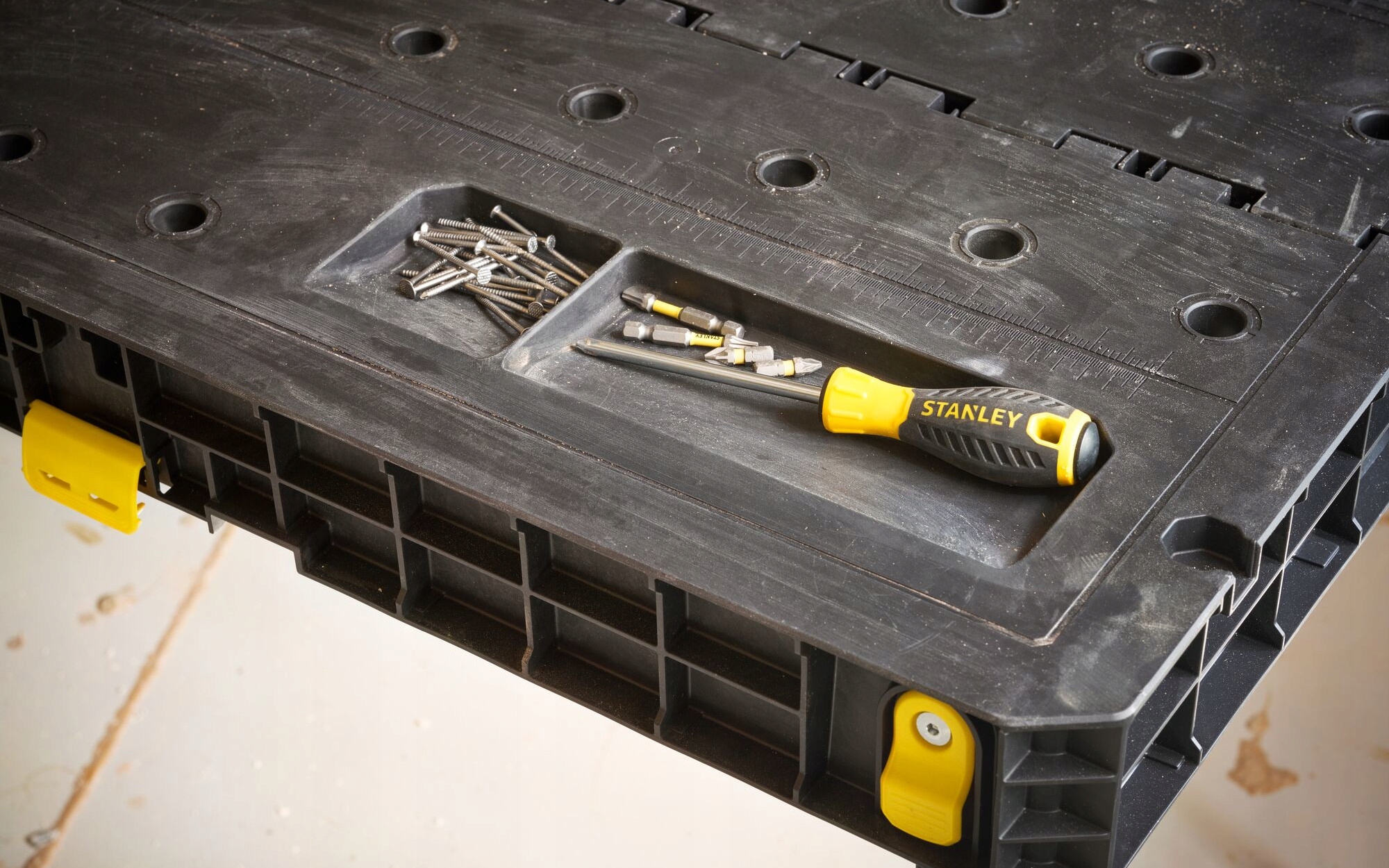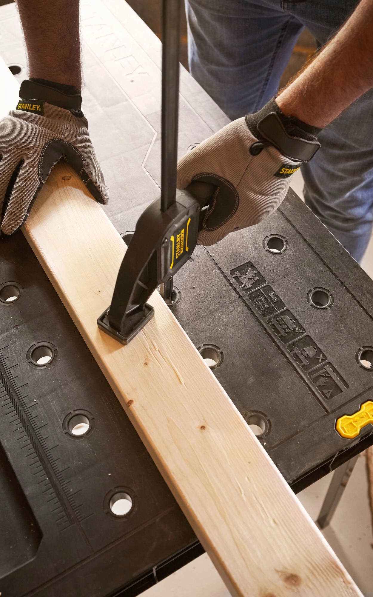 - Также включает концевые защелки, позволяющие соединить несколько складных верстаков STANLEY® для увеличения рабочего пространства.