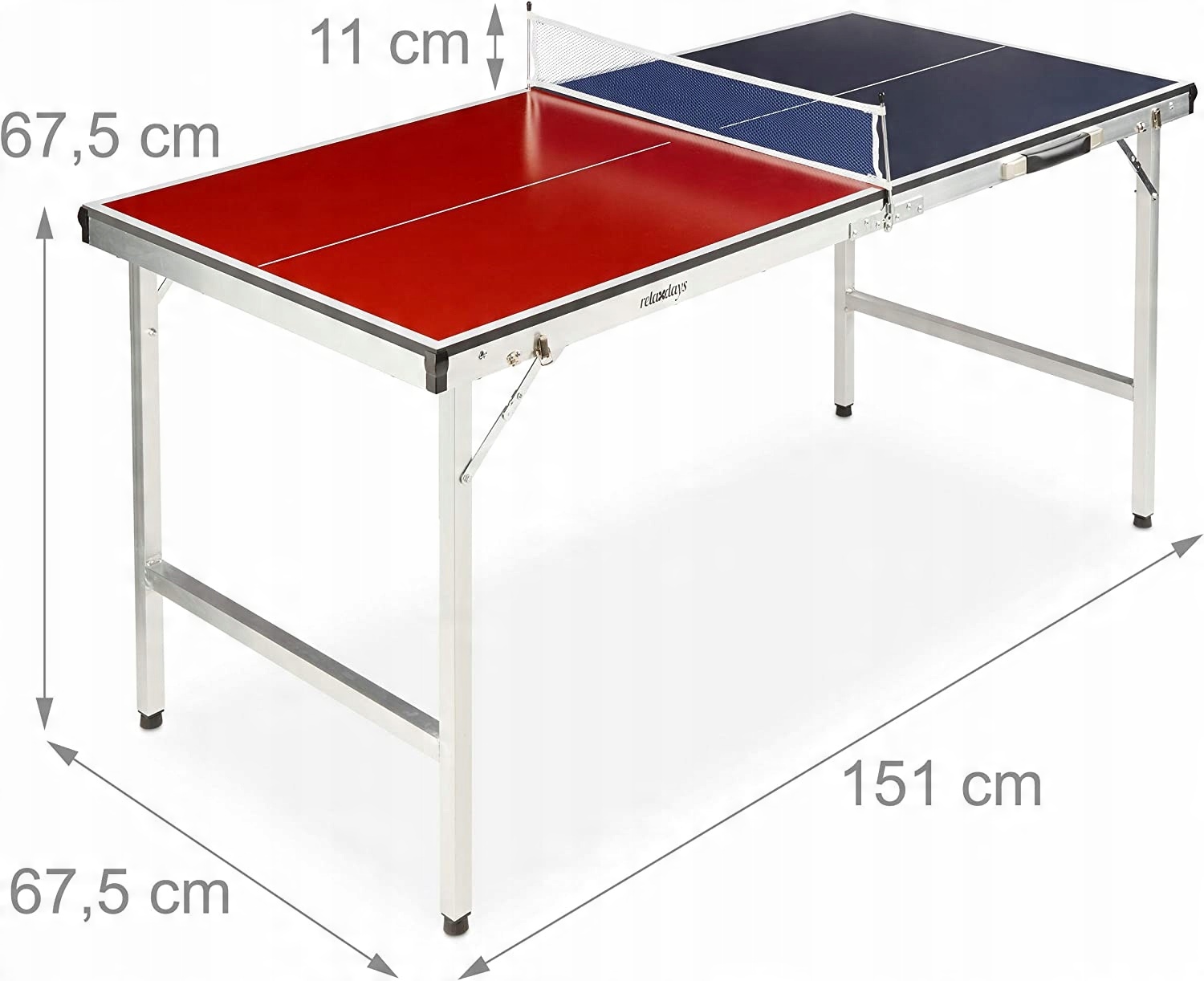 Складной стол для настольного тенниса Relaxdays, переносной, сетка, 2 ракетки, 3 мяча, алюминий, МДФ, В x Ш x Г: 67,5 x 151 x 67,5 см, синий/красный