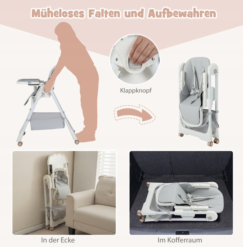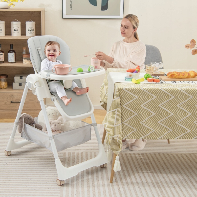 Складывается и Мобильная конструкция : Благодаря складной кнопке детское кресло можно легко сложить и хранить. Складной стульчик для кормления имеет 4 универсальных колеса с возможностью блокировки, поэтому его можно легко переместить в любое место. Также имеется корзина для хранения игрушек и детских вещей.