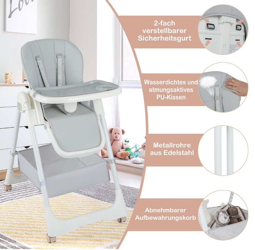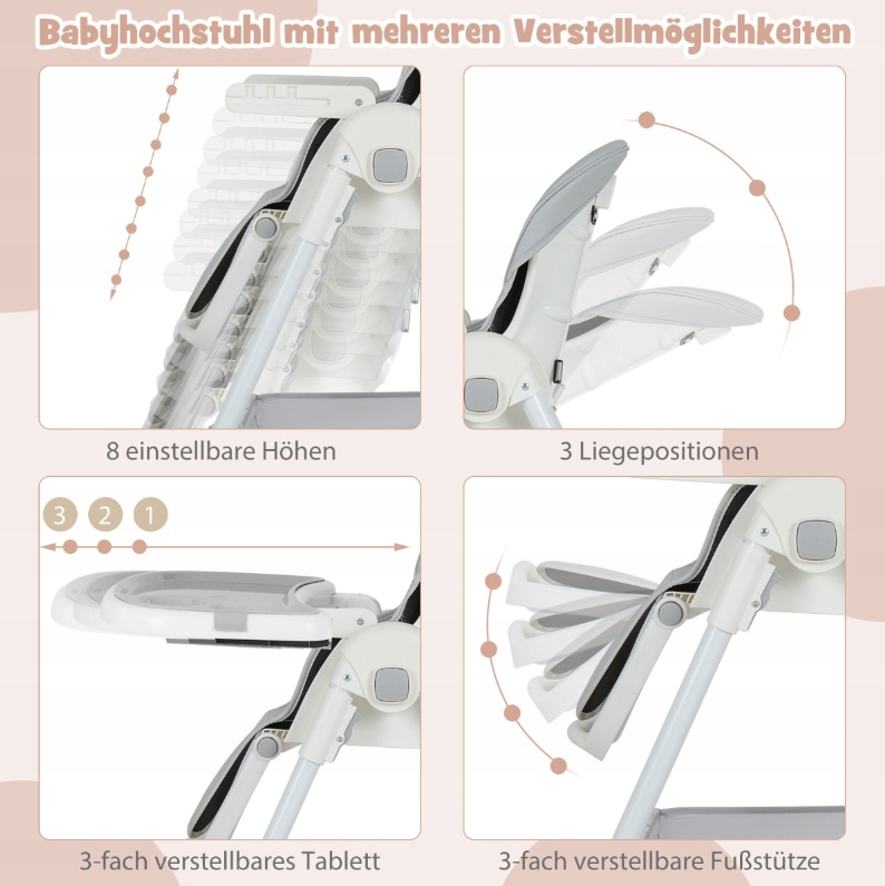 Регулируемый и универсальный стульчик для кормления: Стульчик имеет 4 положения наклона спинки и 3-позиционную регулируемую подставку для ног. Его можно легко отрегулировать на 8 различных высот, поэтому он адаптируется к различным потребностям детей в возрасте от 6 до 36 месяцев.